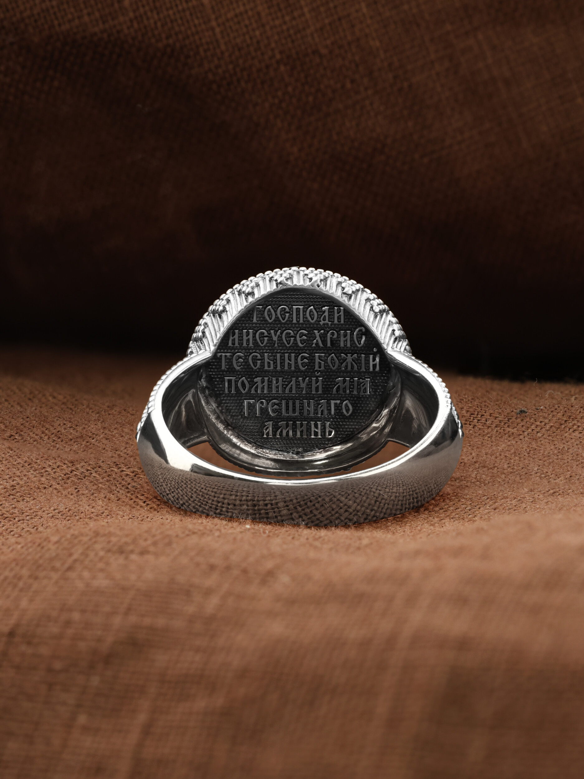 Кольцо «Господь Вседержитель» выполнено в древних христианских традициях. Господь Вседержитель или Пантократор (от греч. всевластный, всесильный). Он представлен как Царь Небесный и будущий Судия мира. Именование Иисуса «Вседержителем» указывает, с одной стороны, на Его Божественную природу: «Аз есмь Альфа и Омега, начало и конец, говорит Господь, Который есть и был и грядет, Вседержитель» (Откр. 1: 8). С другой стороны, такое именование связано и с человеческой природой Христа, искупившего крестной жертвой людские грехи и обновившего тем самым человеческую природу. Господь Иисусь Христос изображен фронтально огрудно. Главу Спасителя осеняет нимб, на нем угадывается крест. Крест символизирует голгофскую жертву Спасителя. По греческой традиции, на нимбе написаны буквы Омега, Омикрон, Ню — вместе они обозначают слово Сущий, одно из имен и характеристику Бога, согласно Священному Писанию. Правой рукой Он благословляет, а левой держит Евангелие — благую весть, принесенную Христом всему миру. Также означает она тот новый мир, который будет сотворен Богом после второго пришествия Христа. Символизирует и Книгу Жизни, где записаны имена всех, возлюбивших Бога. Всемогущий Бог предстает здесь не как обличающий судья, а как милостивый отец, ждущий возвращения блудных детей.