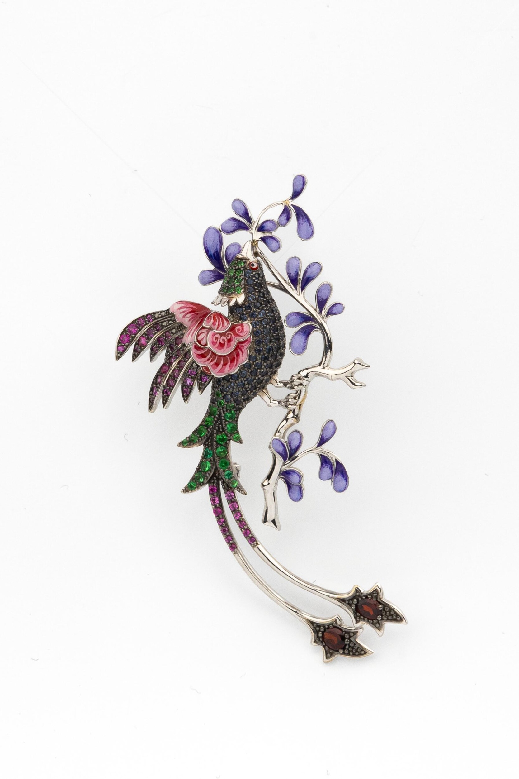 Брошь из белого золота c эмалью, фианитом и гранатом