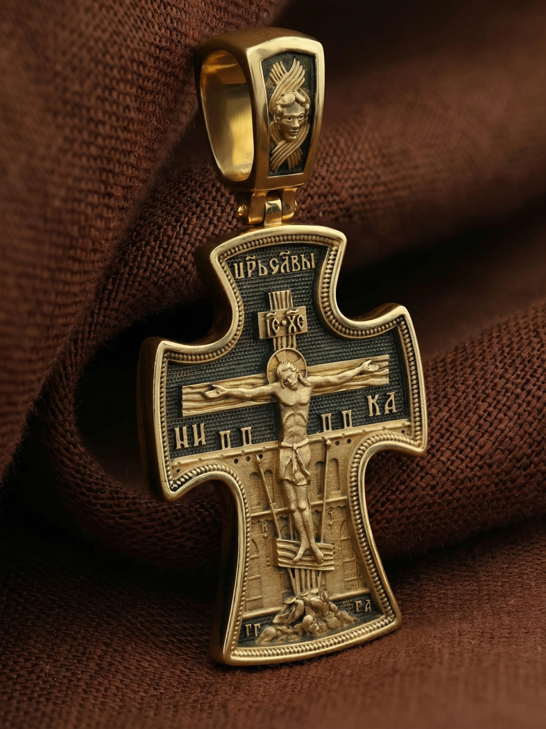 На лицевой стороне креста изображено Распятие, потому что это орудие казни Иисус Христос сделал орудием победы над грехом и смертью. Своими страданиями Он искупил грехи человечества, умерев и сошествовав во ад, победил сатану, освободил души праведников от вечной смерти и открыл им небесные врата рая. Жертва Христа сделала возможным спасение для каждого человека. На православном кресте Христос не умирает, а свободно простирает руки, ладони Иисуса открыты, будто он хочет обнять все человечество, даря им свою любовь и открывая путь к вечной жизни. Над титлом видим слова «ЦРЬ СЛВЫ» — Царь Славы. Верхняя перекладина символизирует собой табличку с надписью «IC XC» — Иисус Христос, ниже перекладины добавляется: «НИКА» (греч. — Победитель). Возвышение, на котором стоит Крест, символизирует гору Голгофу, на которой произошло Распятие. У подножия Креста изображают прах Адама, обозначенный черепом. По сторонам Голгофы начертаны буквы «ГГ» (Гора Голгофа) и «ГА» (голова Адама). Справа и слева от Креста изображены орудия страданий Господа — трость и копие, обозначенные буквами «Т» и «К».