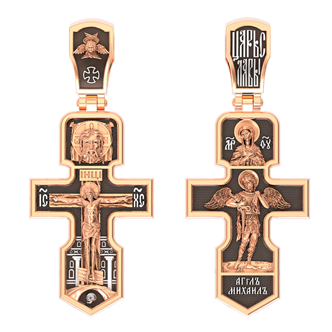 Основной композицией лицевой стороны является Распятие Господа Иисуса Христа. Позади Распятия видна иерусалимская стена, знак того, что Господь был распят вне стен города. Но вместе с тем стена символизирует и Небесный Иерусалим, путь который открылся для человека через Голгофу. У подножья Господа в виде скалистой горки видна сама Голгофа с Главой Адамовой в пещере. Распятие сопровождается каноническими надписями. Это святое имя Христа, которое принято писать на иконах сокращенно — «ИС ХС», словосочетание «СЫН БОЖИЙ», что означает божественную природу Иисуса Христа, и надпись «НИКА» — «победитель». Над Распятием помещено изображение Спаса Нерукотворного — образ Спасителя, который Он запечатлел на плате и передал для исцеления больному проказой царю Эдессы.