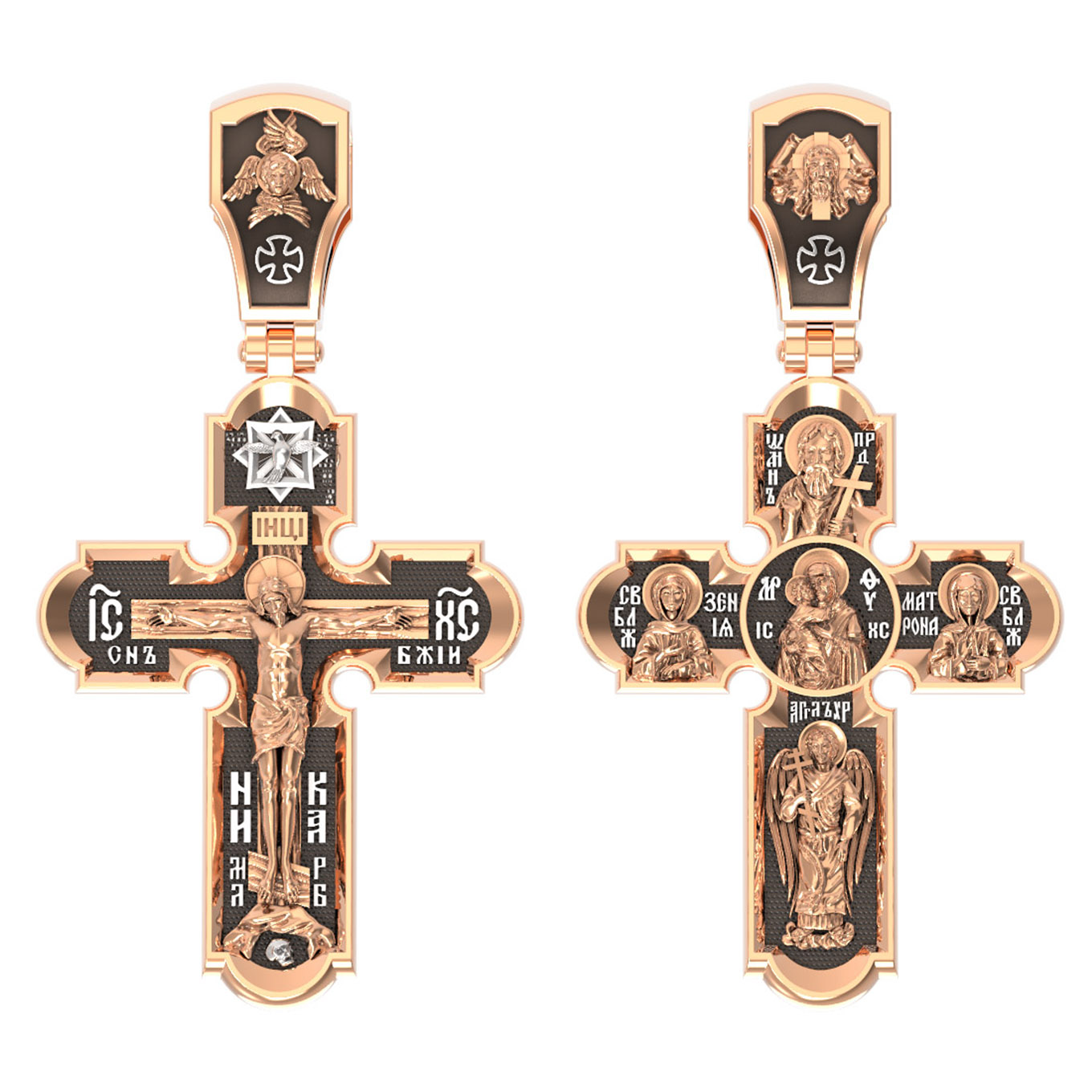 На кресте внизу изображен Ангел Хранитель, слева — Святая Блаженная Ксения, справа — Святая Блаженная Матрона, вверху — пророк, почитающийся в христианстве, Предтеча Господень Иоанн Креститель. На кулонном кольце помещено изображение Спаса Нерукотворного — образ Спасителя, который Он запечатлел на плате и передал для исцеления больному проказой царю Эдессы. Ему придается победное и защитное значение.