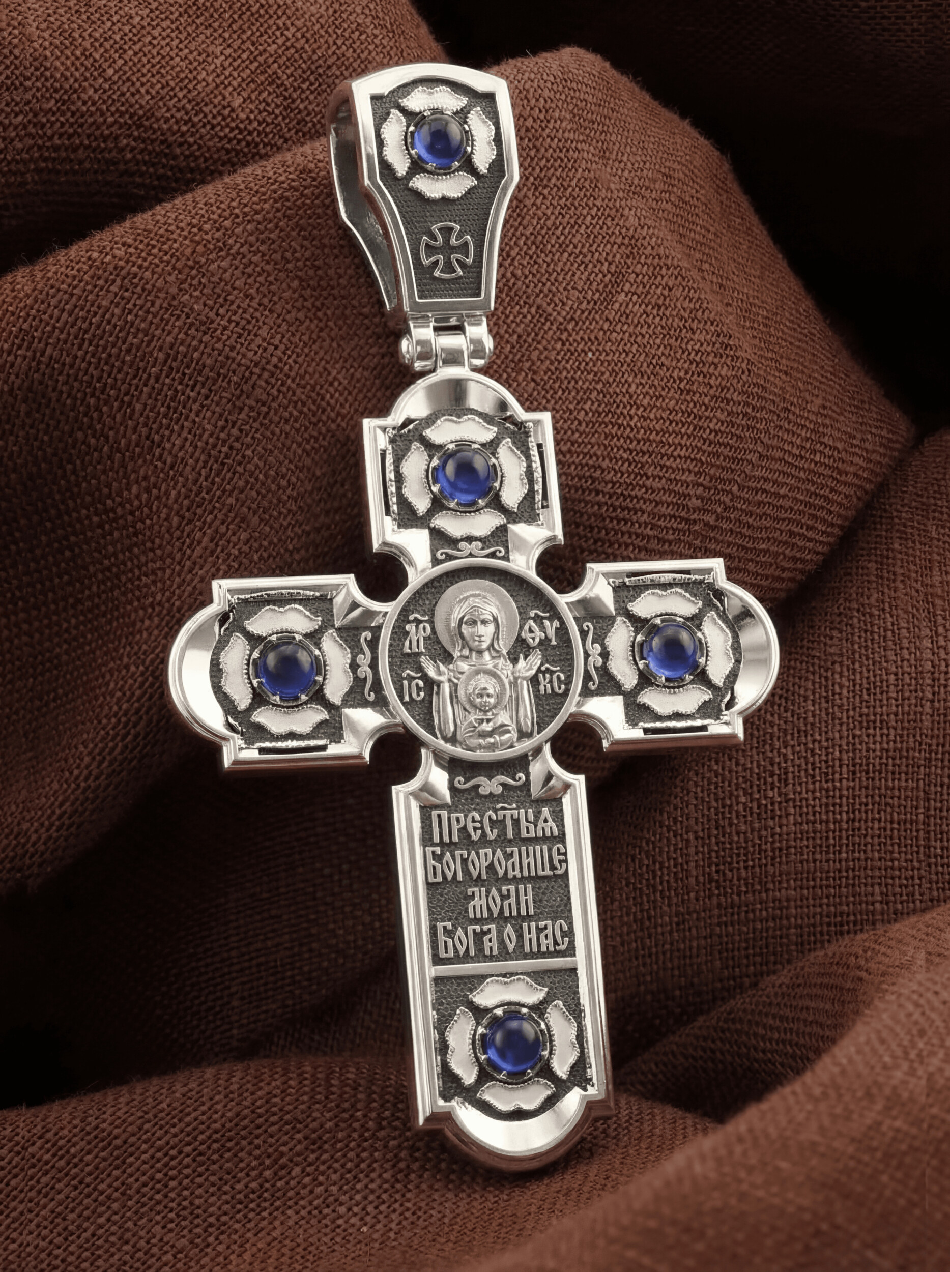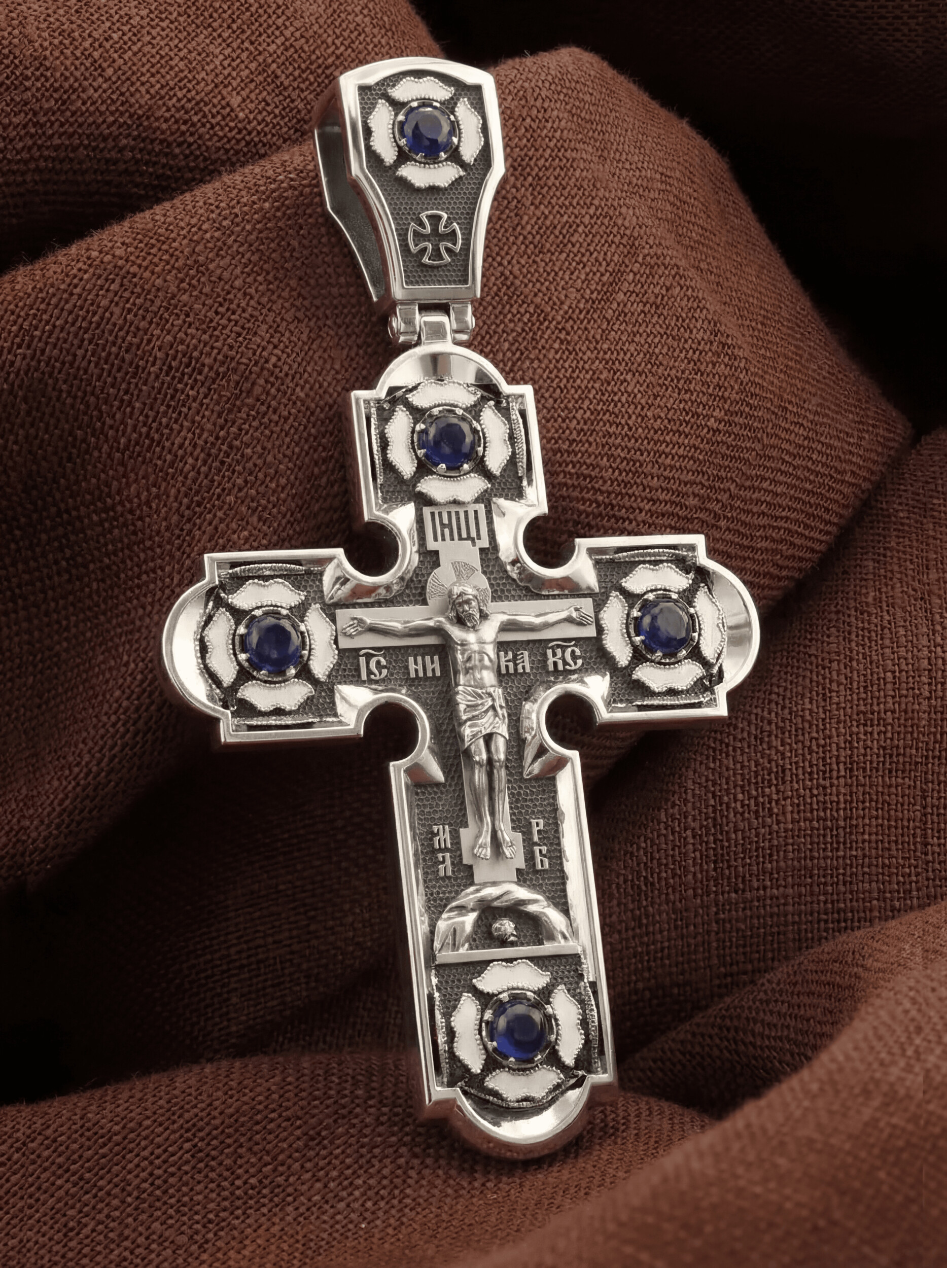 На лицевой стороне креста изображено Распятие Господа и Спасителя нашего Иисуса Христа. Христос, подвергнутый на кресте мучительной казни, своими страданиями искупил нас от древнего греха и даровал нам жизнь вечную. На верхней табличке, выше головы Иисуса, расположена надпись, составленная Понтием Пилатом — «IНЦI». Она означает «Иисус Назорей, Царь Иудейский». Надпись «IС» « ХС» означает Иисус Христос и слово «НИКА», что означает «победитель», помещаются на разных сторонах поперечной перекладины креста. В нижней части креста находится надпись «МЛРБ» — «место лобное рай бысть» означает, что место лобное стало раем. Крест стоит на горе камней, символизирующих Голгофу. Под подножием Креста изображена покоящаяся голова (череп) Адама, грехи которого Христос омыл Своею Кровью. Христос в Своей Божественной любви, над которой смерть не властна и которая, страдая, и не страдает в обычном смысле, простирает к людям со Креста Свои объятия, в которые призывается и привлекается весь мир.