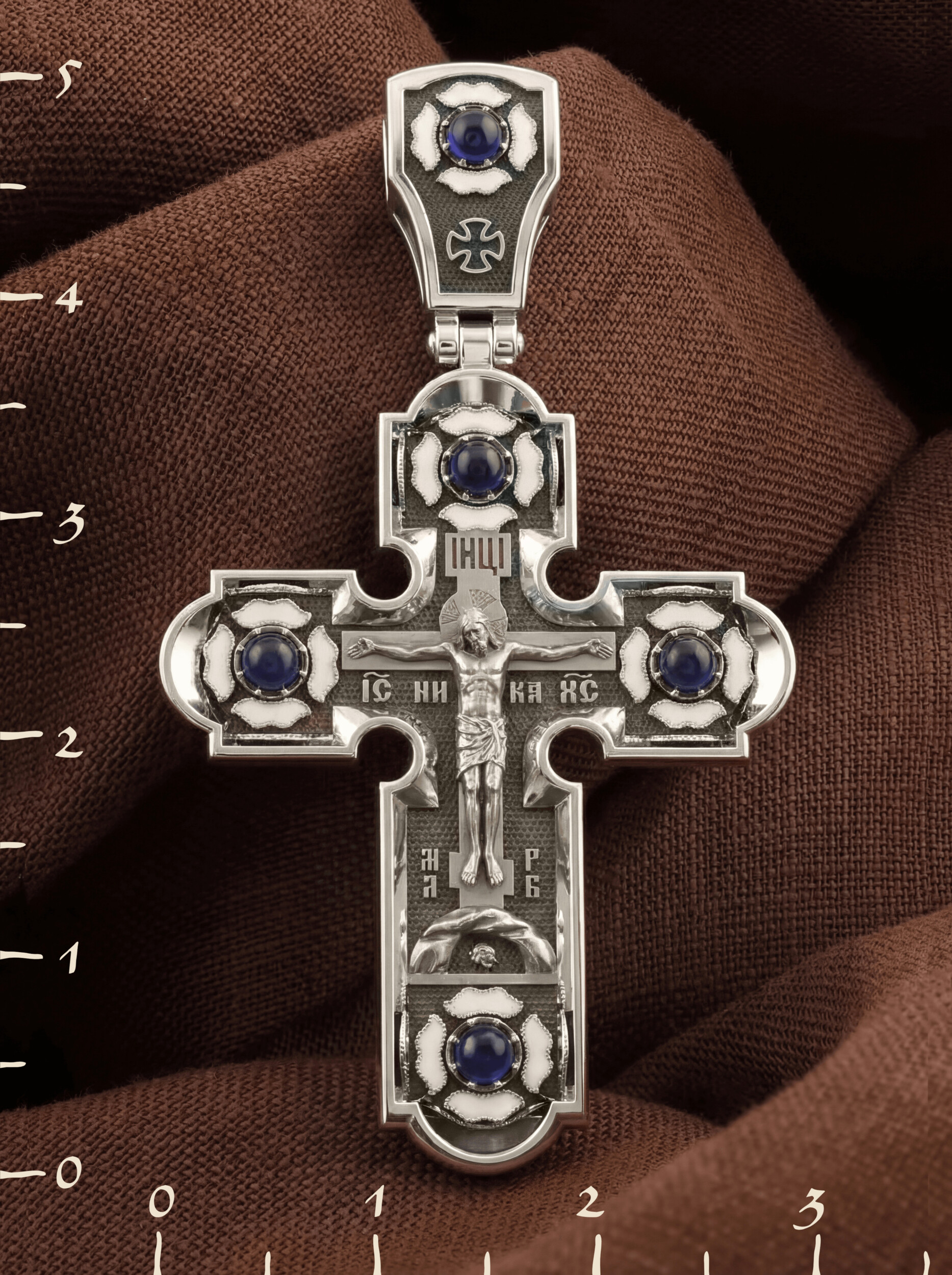 Крест из белого золота c эмалью и сапфиром