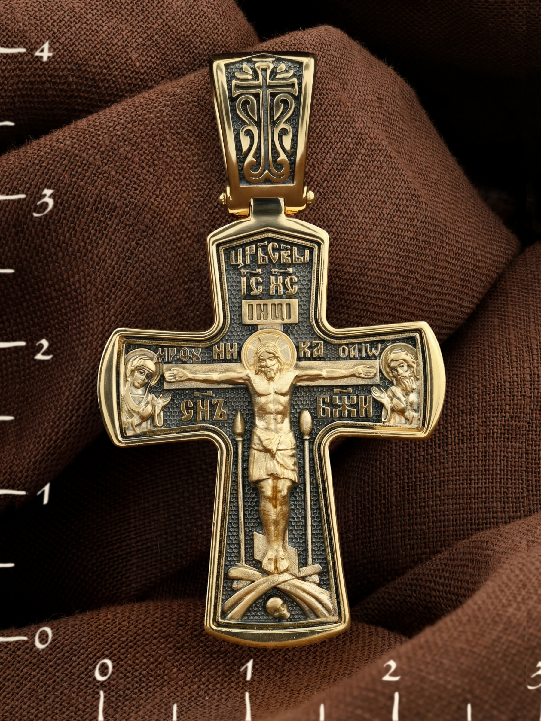 На лицевой стороне креста изображено Распятие Господа и Спасителя нашего Иисуса Христа, отдавшего Себя на смерть, для искупления грехов мира. Крест является символом жертвенной любви Всеблагого Бога к падшим людям, всепобеждающим духовным оружием христиан, основанием и средоточием церковной жизни. Господь сказал: «кто хочет идти за Мною, отвергнись себя, и возьми крест свой, и следуй за Мною». (Мк. 8: 34). На кулонном кольце изображен процветший крест. На верхней табличке, выше головы Иисуса, расположена надпись, составленная Понтием Пилатом — «IНЦI». Она означает «Иисус Назорей, Царь Иудейский». Распятие сопровождается каноническими надписями. Выше Распятия помещена надпись «Царь Славы» и надпись «IC» «ХC», означает Иисус Христос. Слово «НИКА», что означает «победитель» и надпись «Сын Божий», что означает божественную природу Иисуса Христа, помещаются на разных сторонах поперечной перекладины креста. Слева от Распятия изображена Пресвятая Богородица, справа — Про¬рок Предтеча и Креститель Господень Иоанн. Вдоль креста помещены Орудия Страстей Господних — копие сотника Лонгина и трость с губкой. Крест стоит на горе камней, символизирующих Голгофу. В ее основании различается череп– это голова Адама. На православном кресте Христос не умирает, а свободно простирает руки, ладони Иисуса открыты, будто он хочет обнять все человечество, даря им свою любовь и открывая путь к вечной жизни.