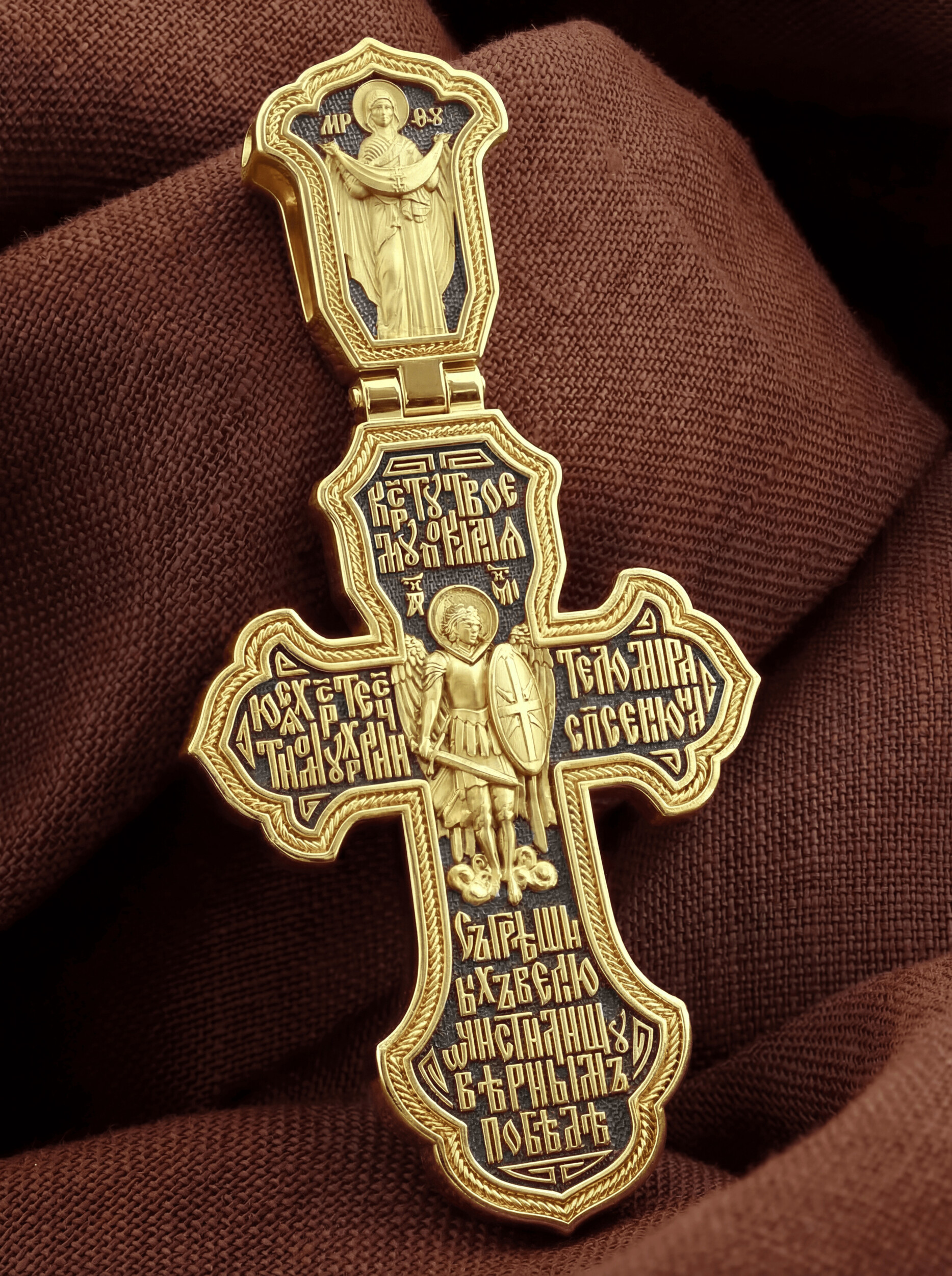 В центре оборотной стороне креста помещен образ Архангела Михаила — верного служителя Божия, который низринул с Неба возгордившегося денницу с другими павшими духами. Он изображен в воинственном виде с огненным мечом в правой руке и щитом в левой. В Православии его называют Архистратигом, что означает глава святого воинства Ангелов и Архангелов. Вокруг образа размещена молитва: «Кресту твоему поклоняемся, Христе, честному хранителю мира, спасения нас грешных, велию очистилищу, верным победе». На кулонной кольце изображена икона Божией Матери «Покров Пресвятой Богородицы». Праздник Покрова Пресвятой Богородицы пришел на Русь в XII веке из Византии и стал одним из самых почитаемых. Богородица простирает Свой молитвенный покров над всеми православными христианами и умоляет Сына своего о даровании вечного спасения каждому человеку.