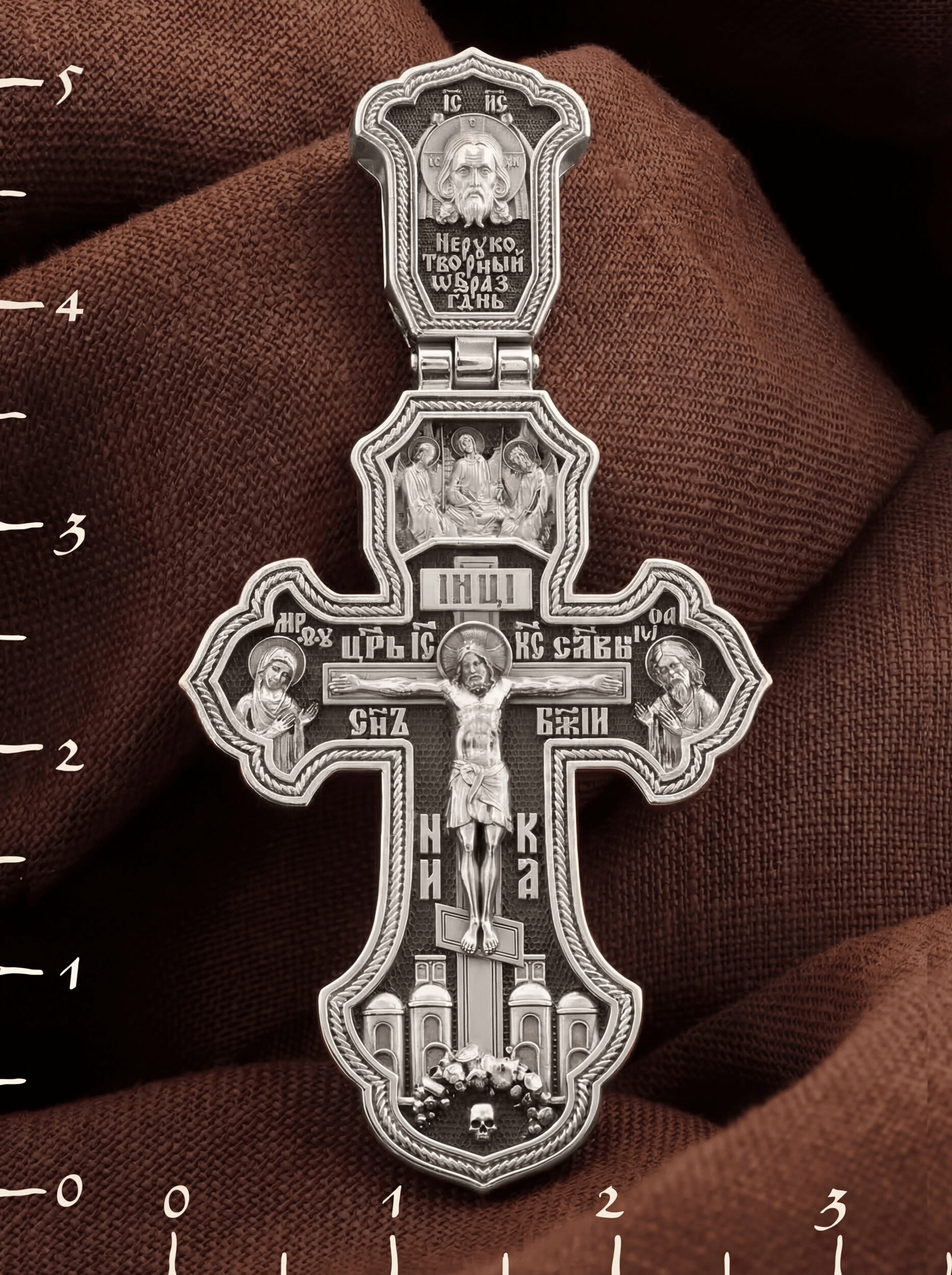 На лицевой стороне креста изображено Распятие Господа и Спасителя нашего Иисуса Христа, отдавшего Себя на смерть, для искупления грехов мира. Крест является символом жертвенной любви Всеблагого Бога к падшим людям, всепобеждающим духовным оружием христиан, основанием и средоточием церковной жизни. Господь сказал: кто хочет идти за Мною, отвергнись себя, и возьми крест свой, и следуй за Мною. (Мк. 8: 34). Над распятием помещена икона Святой Троицы, написанная преподобным Андреем Рублёвым в XV веке. На иконе изображены три ангела, являющихся образом Единосущного и Триипостасного Бога — Святой Троицы. На кулонном кольце изображен Нерукотворный образ Господа и Спасителя нашего Иисуса Христа. На верхней табличке, выше головы Иисуса, расположена надпись, составленная Понтием Пилатом — «IНЦI». Она означает «Иисус Назорей, Царь Иудейский». Надпись «IC» «ХC», означает Иисус Христос, помещается на разных сторонах поперечной перекладины креста. Рядом — слово «НИКА», что означает «победитель» и надпись «Царь Славы». Слева от Распятия изображена Пресвятая Богородица, справа — Про-рок Предтеча и Креститель Господень Иоанн. Ниже расположена надпись «Сын Божий». За крестом высится Иерусалимская стена, в знак того, что Господь был распят вне стен города. Крест стоит на горе камней, символизирующих Голгофу. В ее основании различается череп– это голова Адама.