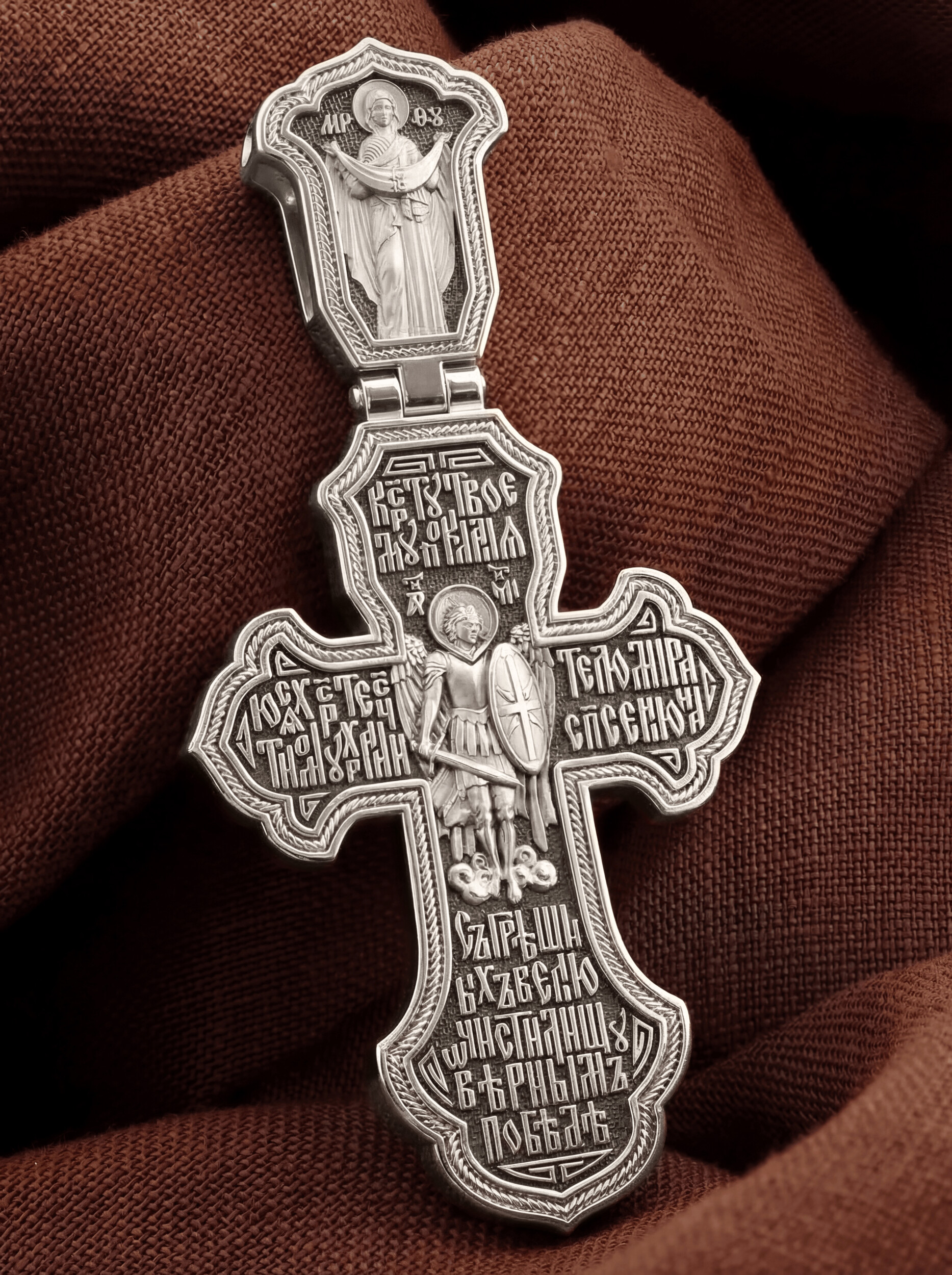 В центре оборотной стороне креста помещен образ Архангела Михаила — верного служителя Божия, который низринул с Неба возгордившегося денницу с другими павшими духами. Он изображен в воинственном виде с огненным мечом в правой руке и щитом в левой. В Православии его называют Архистратигом, что означает глава святого воинства Ангелов и Архангелов. Вокруг образа размещена молитва: «Кресту твоему поклоняемся, Христе, честному хранителю мира, спасения нас грешных, велию очистилищу, верным победе». На кулонной кольце изображена икона Божией Матери «Покров Пресвятой Богородицы». Праздник Покрова Пресвятой Богородицы пришел на Русь в XII веке из Византии и стал одним из самых почитаемых. Богородица простирает Свой молитвенный покров над всеми православными христианами и умоляет Сына своего о даровании вечного спасения каждому человеку.