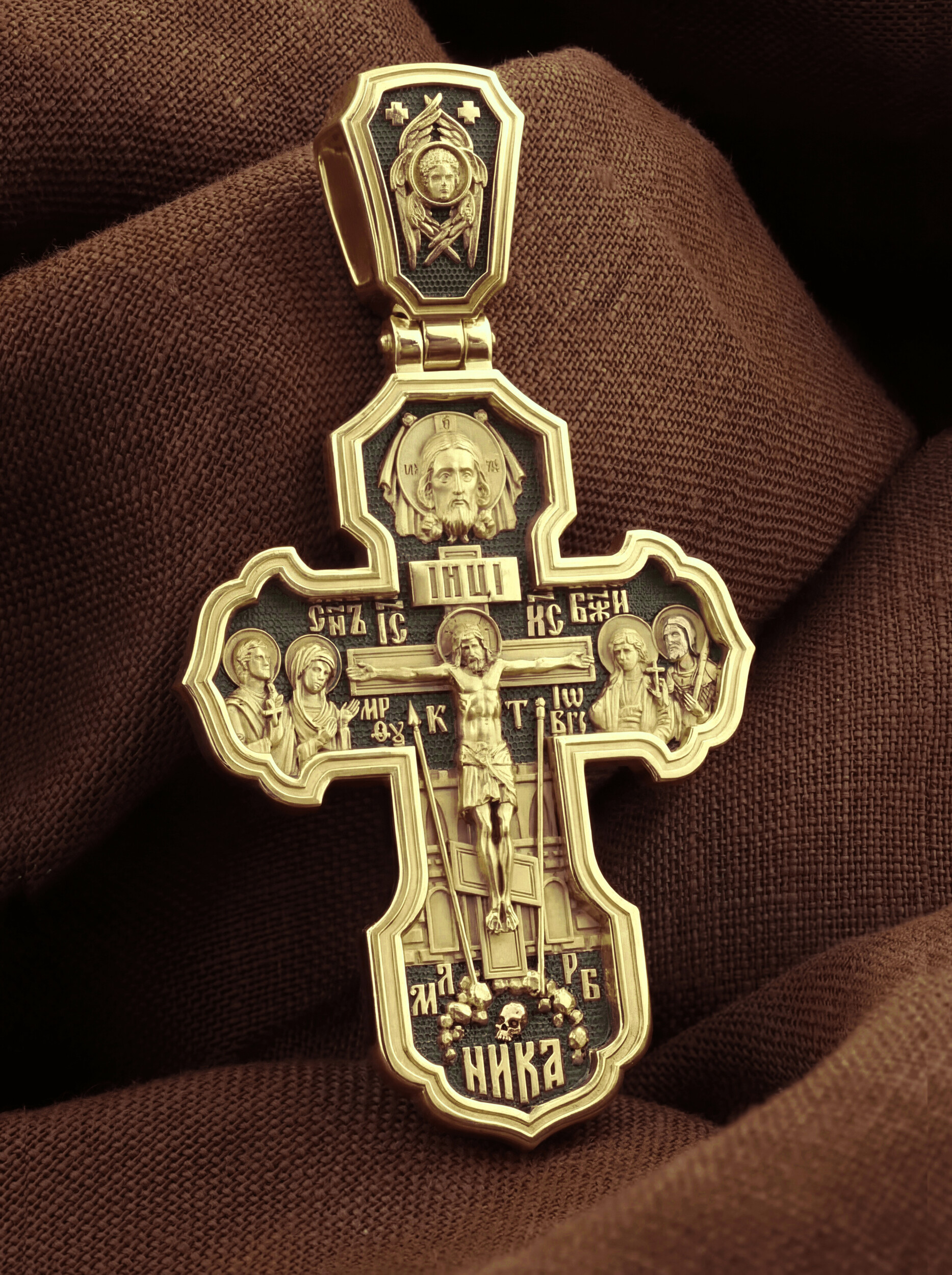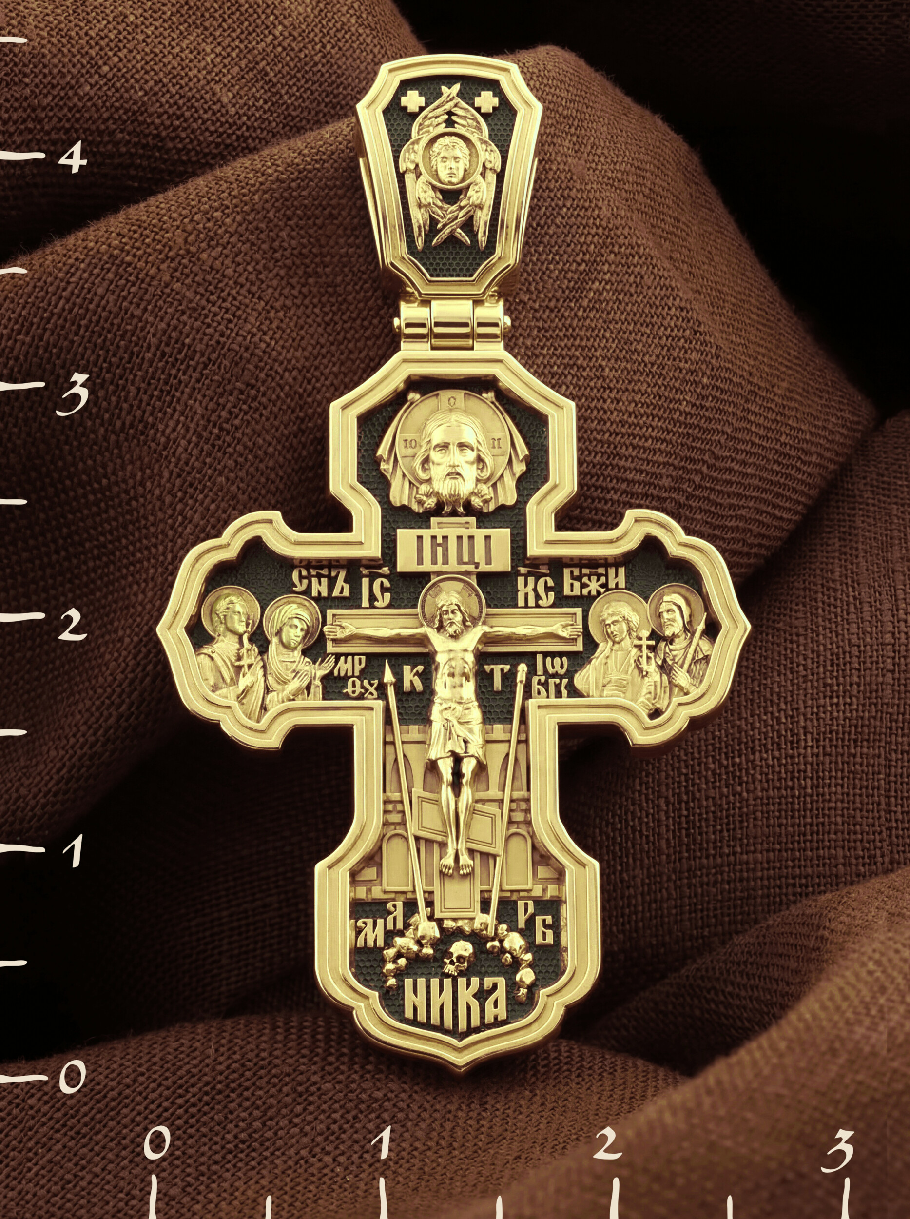 На лицевой стороне креста изображено Распятие Господа и Спасителя нашего Иисуса Христа. Крест- символ спасения и искупления рода человеческого, знамение победы над смертью и адом. Иисус Христос, как искупительная жертва освобождения человечества от власти греха, умер крестной смертью и в третий день воскрес. На верхней табличке, выше головы Иисуса, расположена надпись, составленная Понтием Пилатом — «IНЦI». Она означает «Иисус Назорей, Царь Иудейский». Надпись «IС» « ХС» означает Иисус Христос и помещается на разных сторонах поперечной (большой) перекладины креста. Рядом расположена надпись «Сын Божий». Выше Распятия изображен Нерукотворный образ Господа и Спасителя нашего Иисуса Христа. Слева от Распятия — Пресвятая Богородица и святая мироносица Мария Магдалина с крестом в руке. Справа — апостол и евангелист Иоанн Богослов, один из ближайших учеников Иисуса Христа и сотник Лонгин с крестом в правой руке и копьем — в левой. За крестом высится Иерусалимская стена. Крест стоит на горе камней, символизирующих Голгофу. В ее основании различается череп — это голова Адама. Вдоль креста изображены копие сотника Лонгина и трость с губкой и буквы «К» и «Т». Надпись «МЛРБ» — «место лобное рай бысть» означает, что место лобное стало раем и помещаются в нижней части креста. Рядом — слово «НИКА», что означает «победитель». На православном кресте Христос не умирает, а свободно простирает руки, ладони Иисуса открыты, будто он хочет обнять все человечество, даря им свою любовь и открывая путь к вечной жизни. На кулонном кольце изображен шестикрылый Серафим.