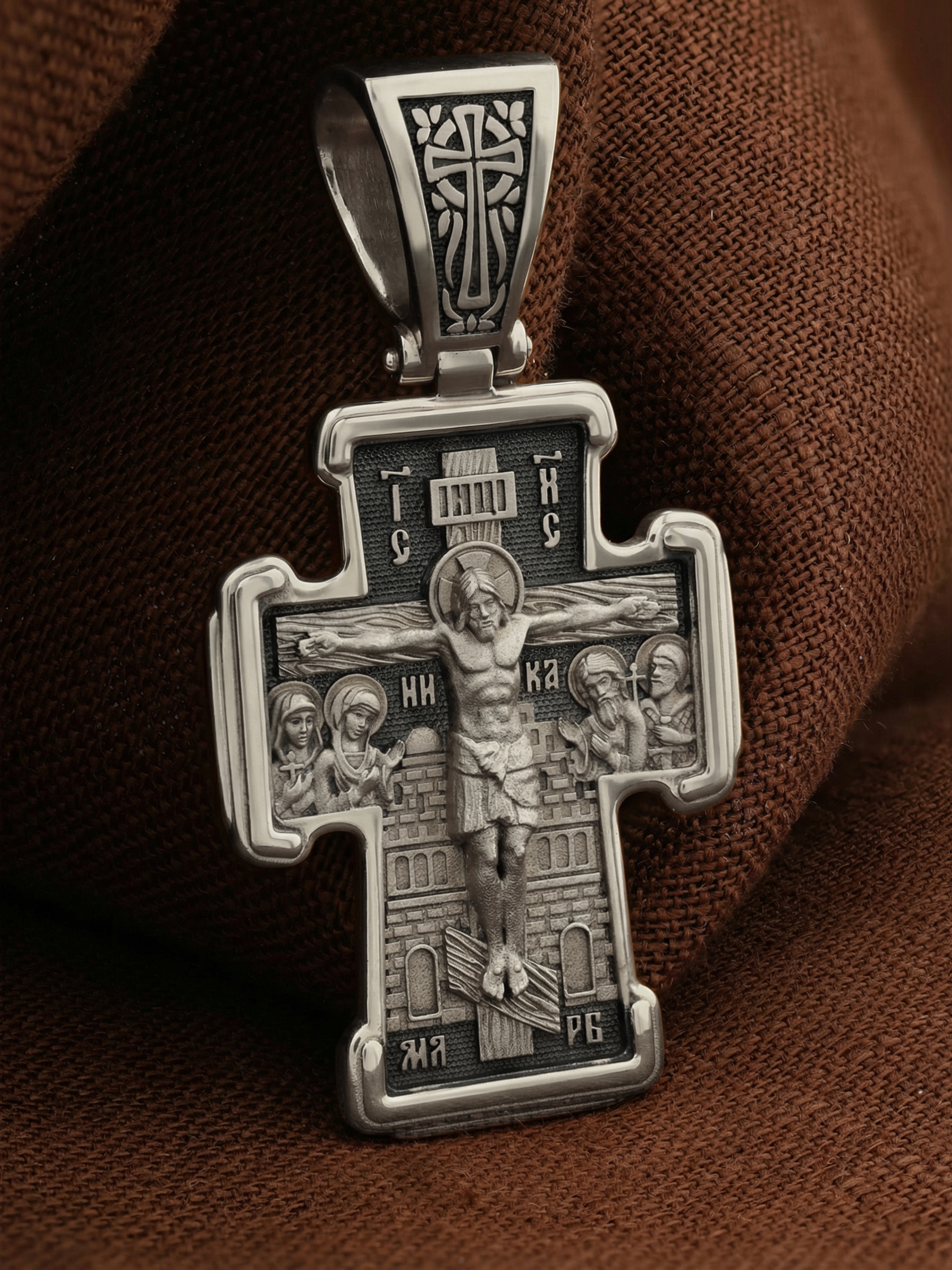 На лицевой стороне креста изображено Распятие Господа и Спасителя нашего Иисуса Христа. Крест- символ спасения и искупления рода человеческого, знамение победы над смертью и адом. Иисус Христос, как искупительная жертва освобождения человечества от власти греха, умер крестной смертью и в третий день воскрес. На верхней табличке, выше головы Иисуса, расположена надпись, составленная Понтием Пилатом — «IНЦI». Она означает «Иисус Назорей, Царь Иудейский». Рядом расположена надпись «IС» « ХС». Она означает Иисус Христос. Ниже — слово «НИКА», что означает «победитель». Слева от Распятия — Пресвятая Богородица и святая мироносица Мария Магдалина с крестом в руке. Справа — апостол и евангелист Иоанн Богослов, один из ближайших учеников Иисуса Христа, и сотник Лонгин с крестом в правой руке и копьем — в левой. За крестом высится Иерусалимская стена. Надпись «МЛРБ» — «место лобное рай бысть» означает, что место лобное стало раем, помещается в нижней части креста. На кулонном кольце помещен крест.