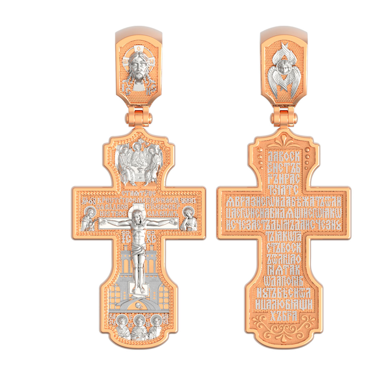 На лицевой стороне креста изображено Распятие Господа и Спасителя нашего Иисуса Христа, отдавшего Себя на смерть, для искупления грехов мира. Крест является символом жертвенной любви Всеблагого Бога к падшим людям, всепобеждающим духовным оружием христиан, основанием и средоточием церковной жизни. Господь сказал: «кто хочет идти за Мною, отвергнись себя, и возьми крест свой, и следуй за Мною». (Мк. 8: 34). Выше Распятия помещены слова молитвы:"Кресту Твоему поклоняемся, Владыко, и святое Воскресение Твое Славим». Над Распятием — образ Святой Троицы в виде трех ангелов. Надпись «IС» « ХС» означает Иисус Христос и находится ниже поперечной перекладины креста. Слева от Распятия изображена Пресвятая Богородица. Справа — апостол и евангелист Иоанн Богослов, один из ближайших учеников Иисуса Христа. За крестом высится Иерусалимская стена. Крест стоит на горе камней, символизирующих Голгофу. В ее основании различается череп — это голова Адама. Ниже распятия изображены отцы Церкви — Святители Василий Великий, Григорий Богослов и Иоанн Златоуст. На православном кресте Христос не умирает, а свободно простирает руки, ладони Иисуса открыты, будто он хочет обнять все человечество, даря им свою любовь и открывая путь к вечной жизни. На кулонном кольце изображен Нерукотворный образ Господа и Спасителя нашего Иисуса Христа, чудесно отпечатавшийся на плате, которым Христос вытер свой лик.