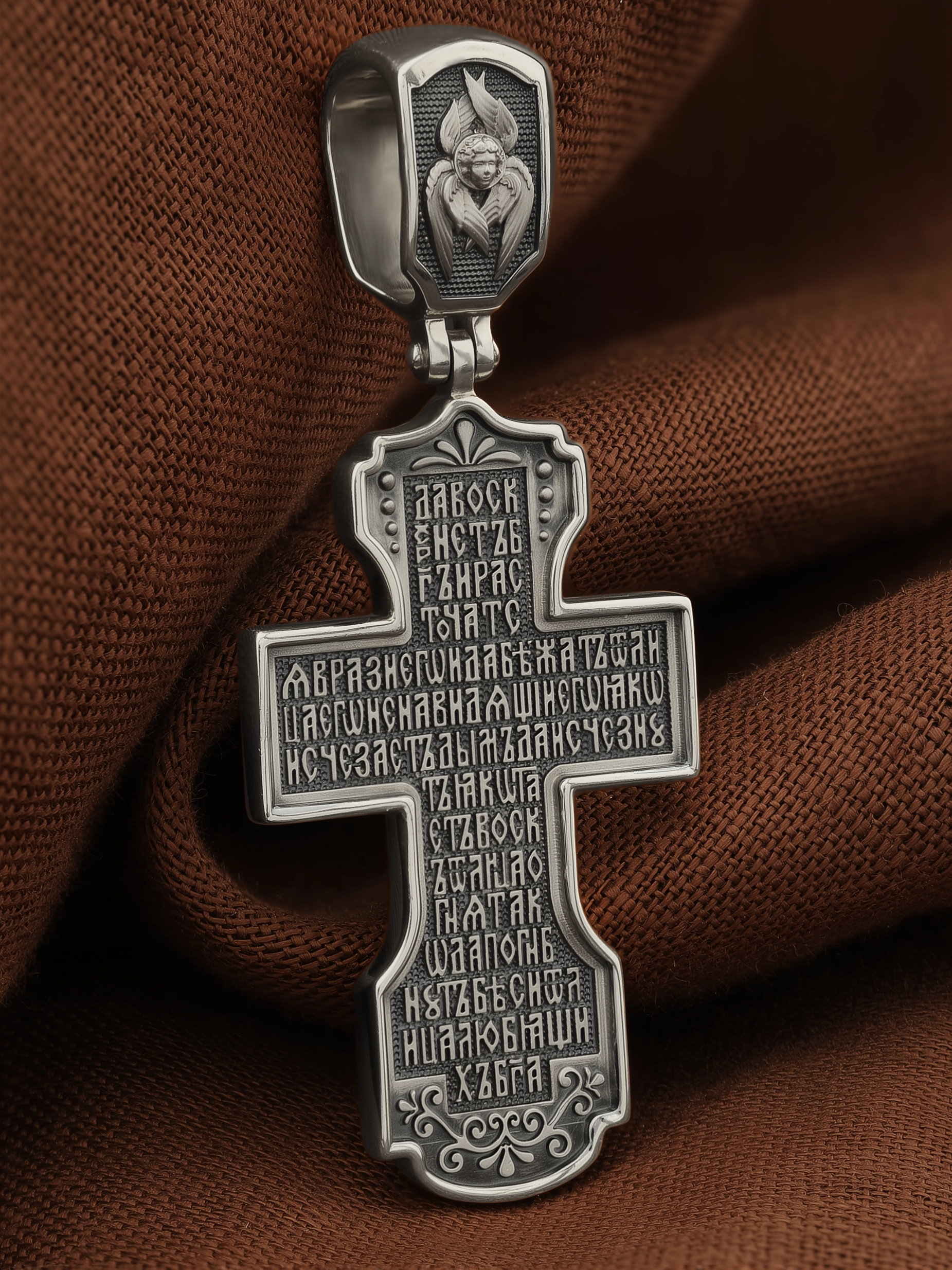 На оборотной стороне креста помещена молитва Честному Кресту Господню: «Да воскреснет Бог, и расточатся врази Его, и да бежат от лица Его ненавидящии Его. Яко исчезает дым, да исчезнут; яко тает воск от лица огня, тако да погибнут беси от лица любящих Бога…». На кулонном кольце изображен шестикрылый Серафим.