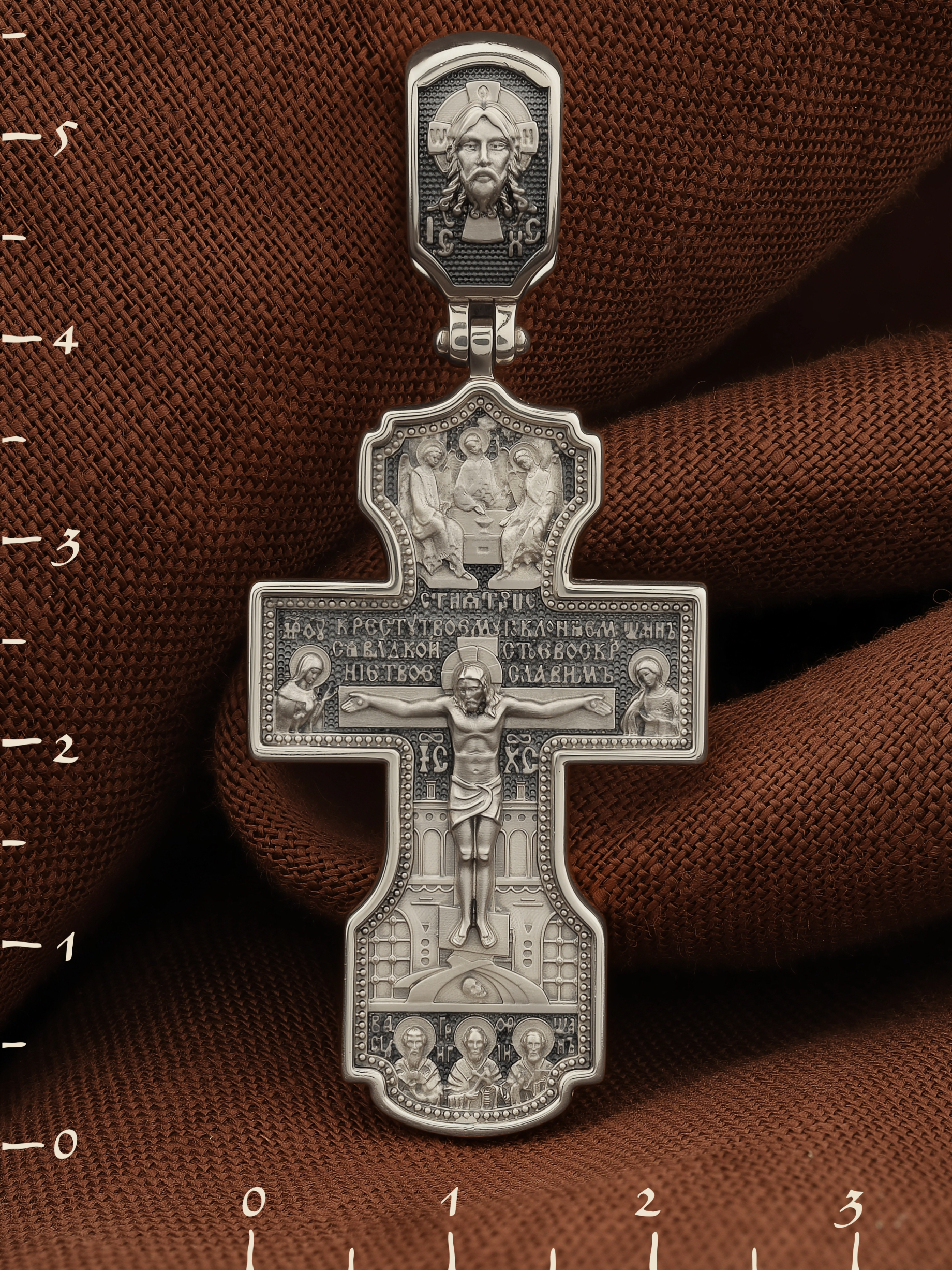 На лицевой стороне креста изображено Распятие Господа и Спасителя нашего Иисуса Христа, отдавшего Себя на смерть, для искупления грехов мира. Крест является символом жертвенной любви Всеблагого Бога к падшим людям, всепобеждающим духовным оружием христиан, основанием и средоточием церковной жизни. Господь сказал: «кто хочет идти за Мною, отвергнись себя, и возьми крест свой, и следуй за Мною». (Мк. 8: 34). Выше Распятия помещены слова молитвы:"Кресту Твоему поклоняемся, Владыко, и святое Воскресение Твое Славим». Над Распятием — образ Святой Троицы в виде трех ангелов. Надпись «IС» « ХС» означает Иисус Христос и находится ниже поперечной перекладины креста. Слева от Распятия изображена Пресвятая Богородица. Справа — апостол и евангелист Иоанн Богослов, один из ближайших учеников Иисуса Христа. За крестом высится Иерусалимская стена. Крест стоит на горе камней, символизирующих Голгофу. В ее основании различается череп — это голова Адама. Ниже распятия изображены отцы Церкви — Святители Василий Великий, Григорий Богослов и Иоанн Златоуст. На православном кресте Христос не умирает, а свободно простирает руки, ладони Иисуса открыты, будто он хочет обнять все человечество, даря им свою любовь и открывая путь к вечной жизни. На кулонном кольце изображен Нерукотворный образ Господа и Спасителя нашего Иисуса Христа, чудесно отпечатавшийся на плате, которым Христос вытер свой лик.