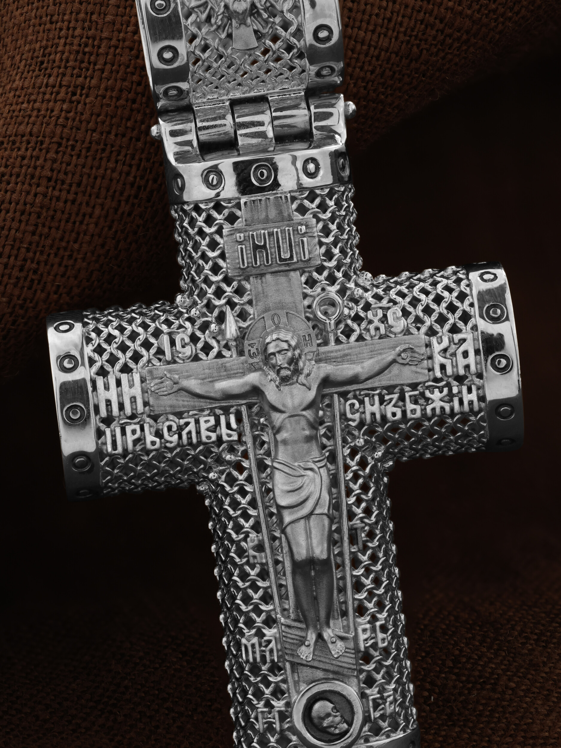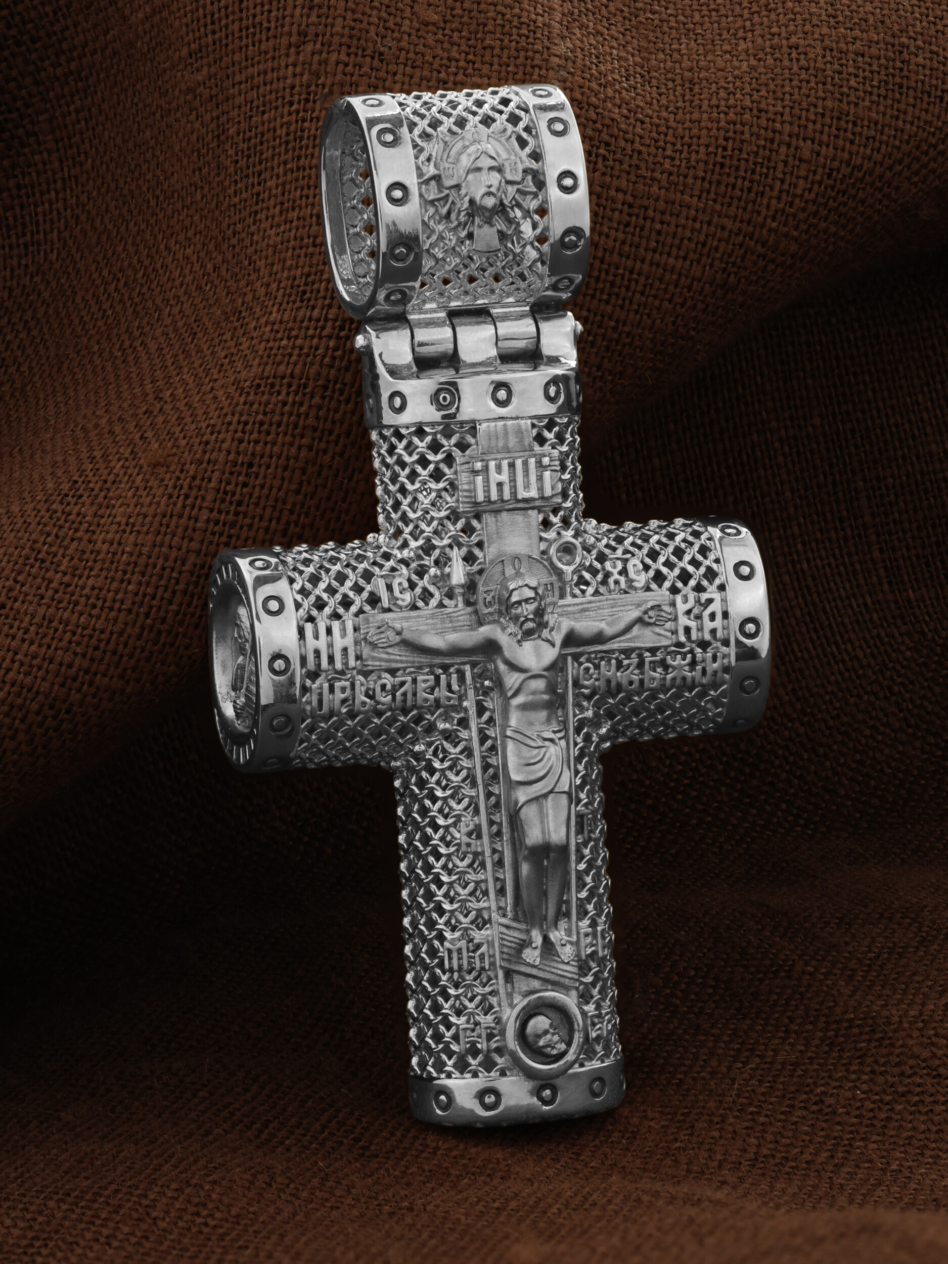 На лицевой стороне креста изображено Распятие Господа и Спасителя нашего Иисуса Христа. Крест- символ спасения и искупления рода человеческого, знамение победы над смертью и адом. Иисус Христос, как искупительная жертва освобождения человечества от власти греха, умер крестной смертью и в третий день воскрес. Распятие сопровождается каноническими надписями. На верхней табличке, выше головы Иисуса, расположена надпись, составленная Понтием Пилатом — «IНЦI». Она означает «Иисус Назорей, Царь Иудейский». Надписи «IC» «ХC», означает Иисус Христос, «НИКА», что означает Победитель, «Царь Славы» и «Сын Божий», размещается на разных сторонах поперечной перекладины креста. Крест стоит на горе камней, символизирующих Голгофу, которая обозначена надписью «Г Г». В ее основании различается череп — это голова Адама, обозначенный надписью «Г А». Надпись «МЛРБ» — «место лобное рай бысть» означает место лобное стало раем. Вдоль креста изображены орудия Страстей Христовых: копие сотника Лонгина, которым пронзили подреберье мёртвого Иисуса, чтобы убедиться в Его смерти, и трость с губкой, с которой Иисуса напоили уксусом. Они обозначены буквами «К» и «Т». На кулонном кольце размещен «Нерукотворный образ Иисуса Христа», на оборотной стороне кулонного кольца- шестикрылый Серафим.