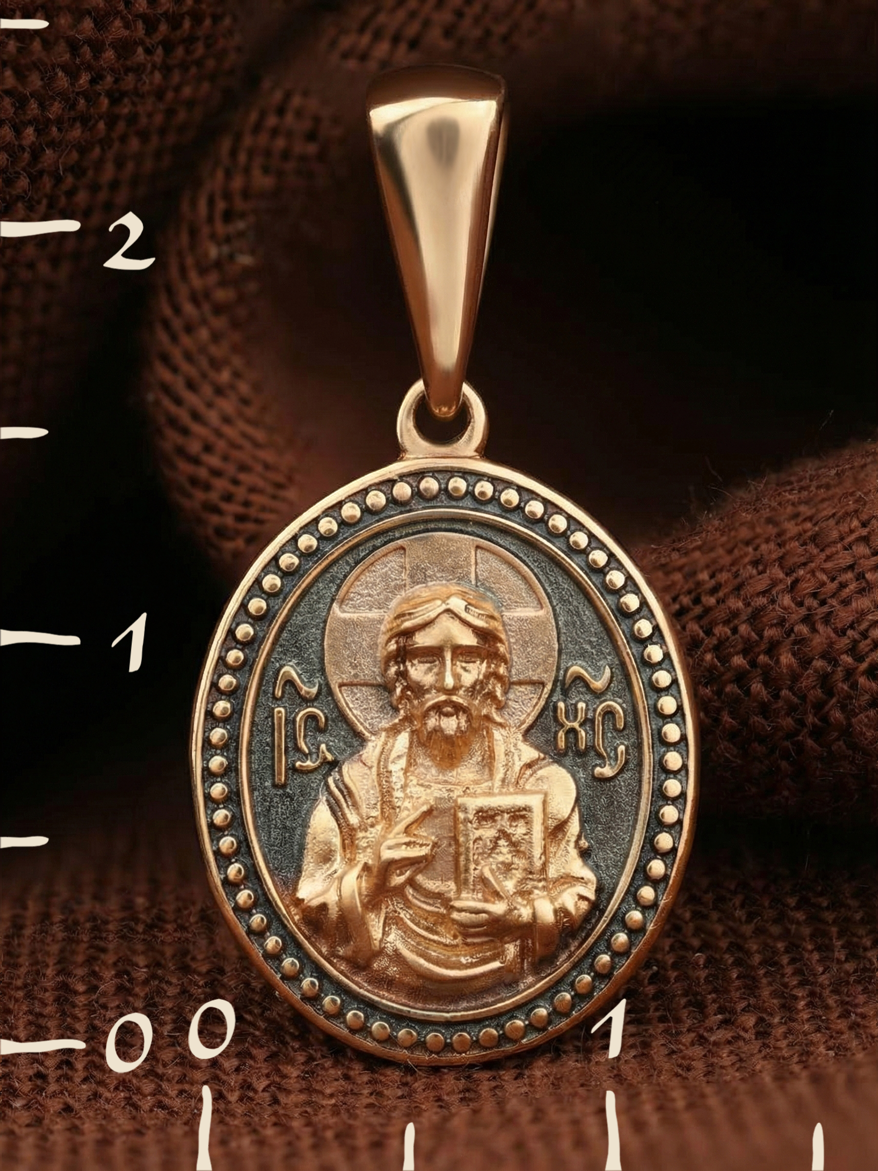 На лицевой части образка изображен Спас Вседержитель или Пантократор (от греч. «панратос» — всевластный, всесильный) — центральный образ в иконографии Христа, представляющий Его как Небесного Царя и Судию. Господь правой рукой благословляет, а в левой держит Книгу Жизни, в которой для каждого человека есть своя страница.