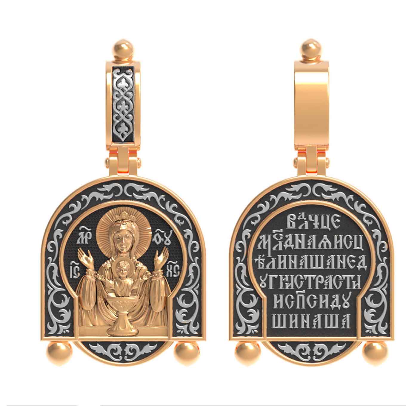 На лицевой части образка изображена икона Божией Матери «Неупиваемая чаша». Икона славится помощью в исцелении зависимостей, помогает людям обрести свободу от греховных страстей.