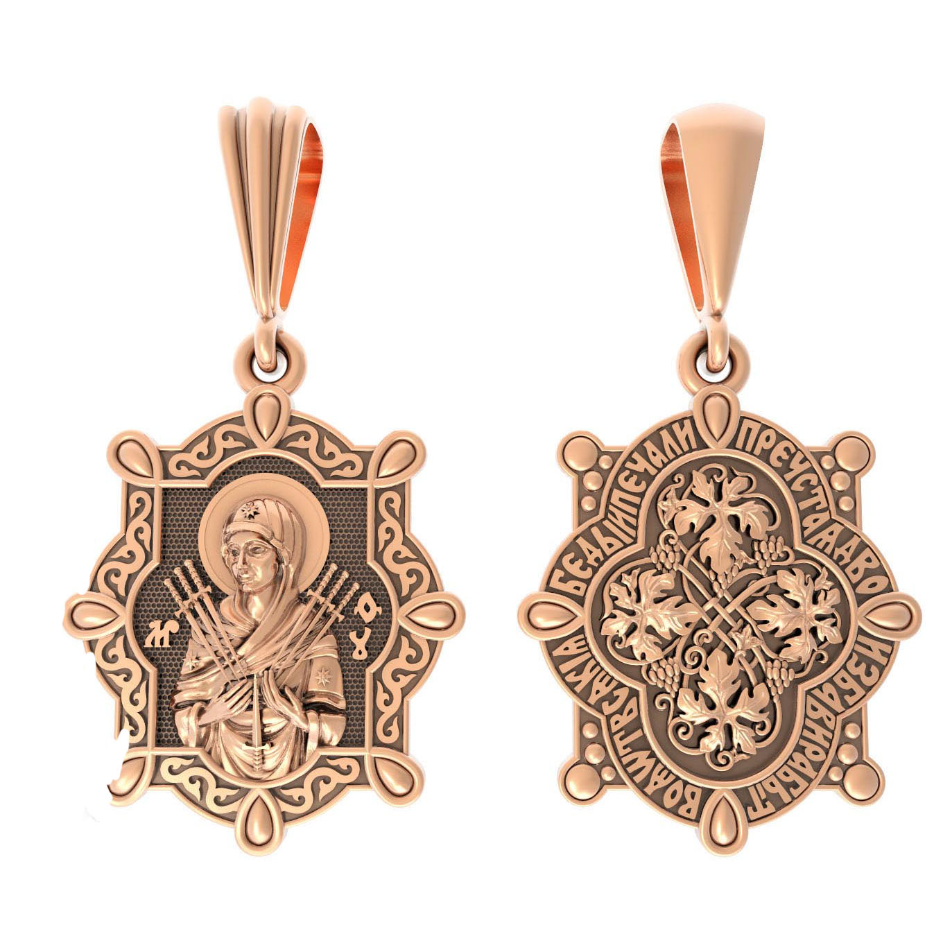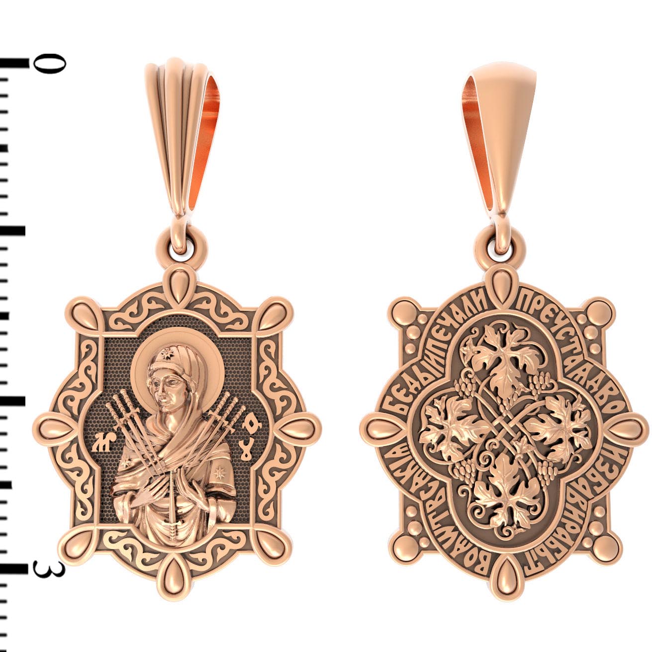 На лицевой стороне образка изображена икона Пресвятой Богородицы «Семистрельная» — одна из самых чудотворных икон на Руси. На протяжении многих веков христиане взывали к Царице Небесной через эту икону, если в стране начинались войны или мятежи.