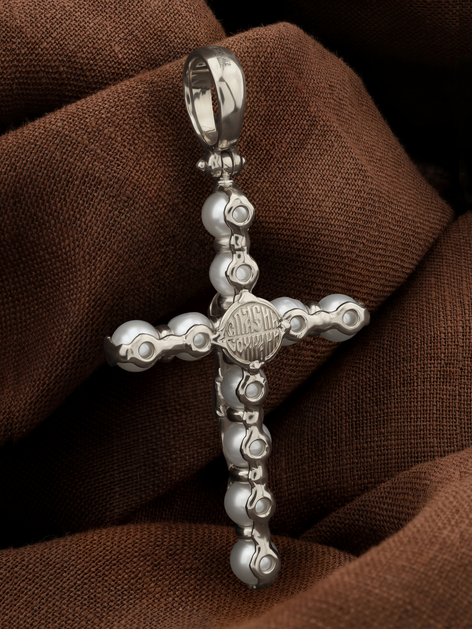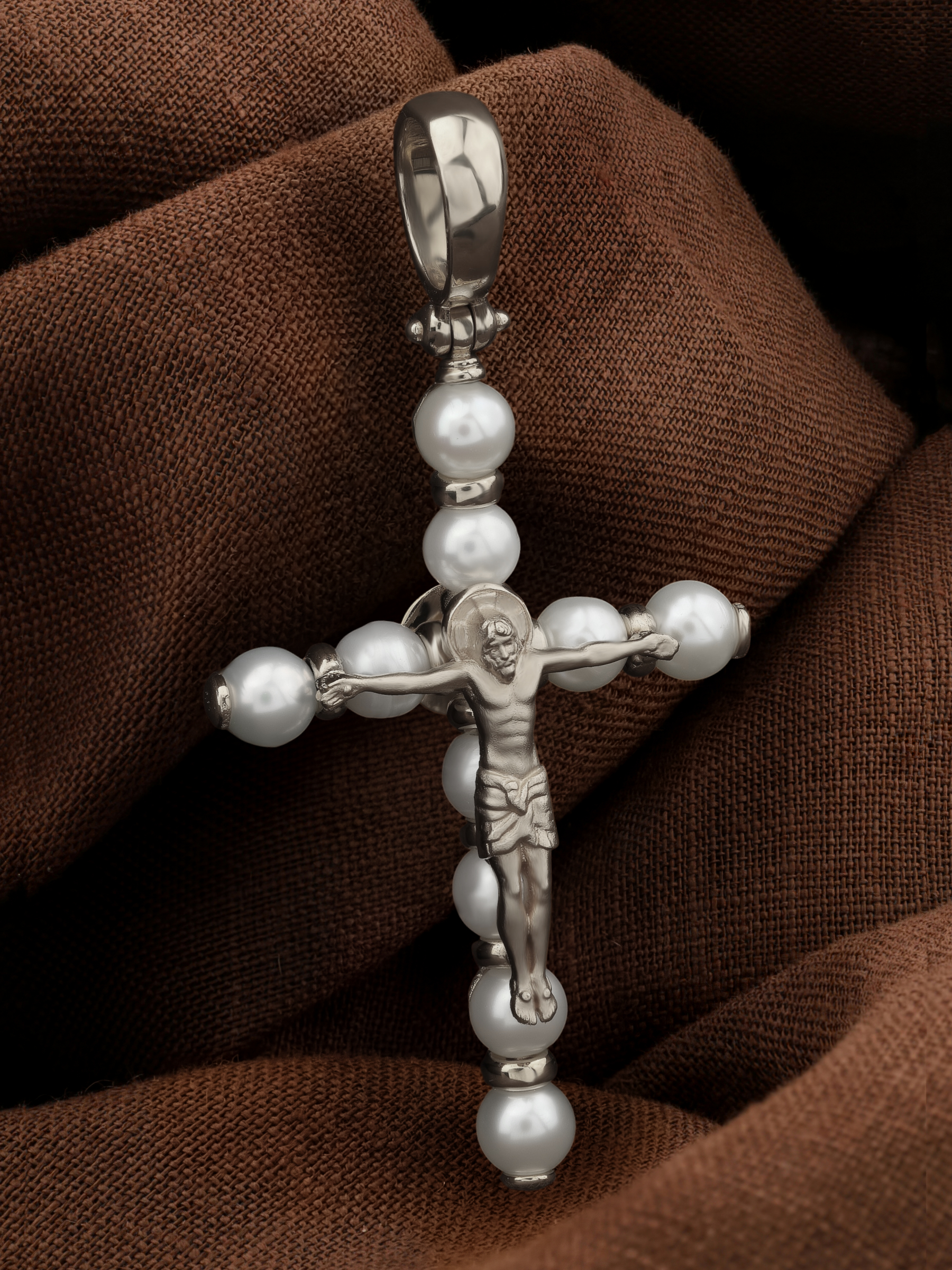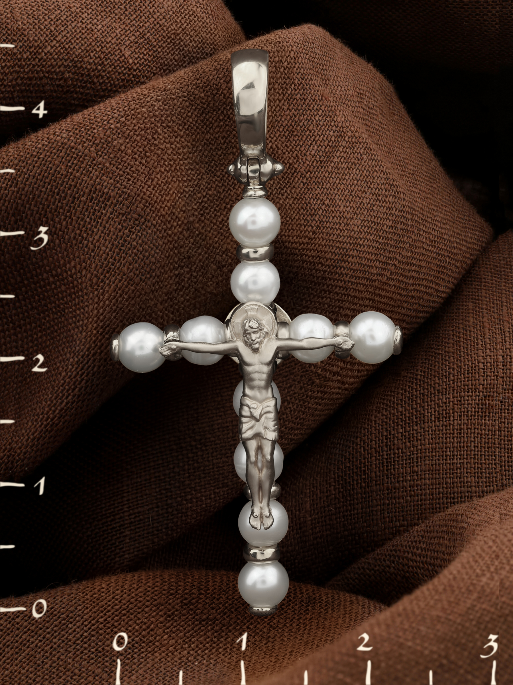 На лицевой стороне креста изображено Распятие Господа и Спасителя нашего Иисуса Христа. Своими крестными страданиями Господь смыл наши грехи, покрыл наш долг перед Богом или, на языке Писания, нас «искупил». В Голгофе сокрыта непостижимая тайна бесконечной правды и любви Бога. Крест стал символом победы добра над злом, жизни над смертью, напоминанием бесконечной Божьей любви, предметом радости. Воплотившийся Сын Божий Своею кровью освятил крест и сделал его проводником Своей благодати, источником освящения верующих. На верхней табличке, выше головы Иисуса, расположена надпись, составленная Понтием Пилатом — «IНЦI». Она означает «Иисус Назорей, Царь Иудейский». Надпись «IC» «ХC», означает Иисус Христос, помещаются на разных сторонах поперечной перекладины креста. Христос в Своей Божественной любви, над которой смерть не властна и которая, страдая, и не страдает в обычном смысле, простирает к людям со Креста Свои объятия, в которые призывается и привлекается весь мир. Поэтому Тело Его не висит, а торжественно покоится на Кресте.