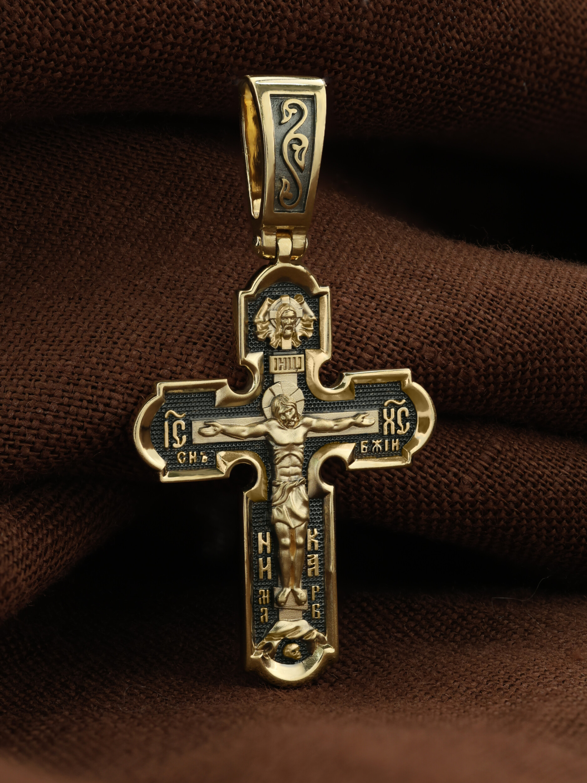 На лицевой стороне нательного креста по традиции изображено Распятие Господа нашего Иисуса Христа. Крест Господень стоит на небольшом каменистом возвышении, символизирующем гору Голгофу, которая обозначена буквами МЛРБ (Место Лобное Рай Бысть). Над головой Господа на поперечной перекладине написано «ИНЦИ», что символизирует табличку, которая была прибита к Кресту, с надписью «Иисус Назорей Царь Иудейский». Этим иудеи хотели посмеяться над Христом, не зная, что распинают истинного Царя всех царей. По сторонам основной перекладины расположены позолоченные рельефные инициалы Христа «ИС ХС». Под перекладиной, по сторонам древа, находится надпись «СЫН БОЖИЙ», а в основании креста — надпись «НИКА» (Победитель).