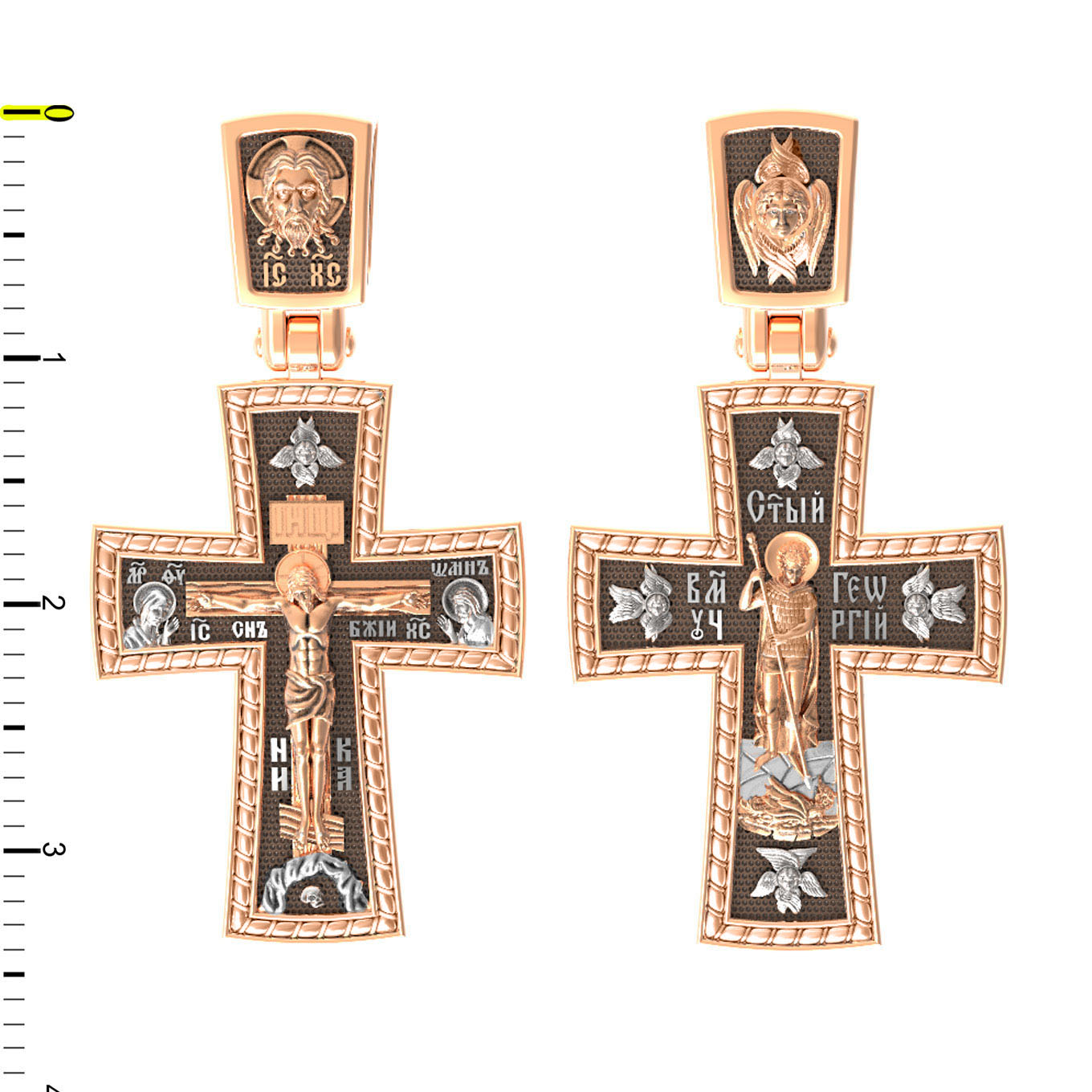 В центре оборотной стороне креста помещен образ Святого Великомученика Георгия Победоносца — одного из самых почитаемых и удивительных святых. На Руси он известен как Юрий или Егорий, покровитель воинов, помощник в крестьянском труде. На образке он изображен как воитель поражающий копьем огнедышащего змея. Змей символизирует собою сатанинские силы. Молитвами вознесенными к Всевышнему и своей непреклонной верой он смог одолеть чудовище. Святой убил змея, спас царскую дочь, принесенную в жертву, и жителей города, их души от влияния дьявола, породив в них надежду и веру в Господа, призывая людей принять христианскую веру. Вокруг образа изображены четыре Серафима.