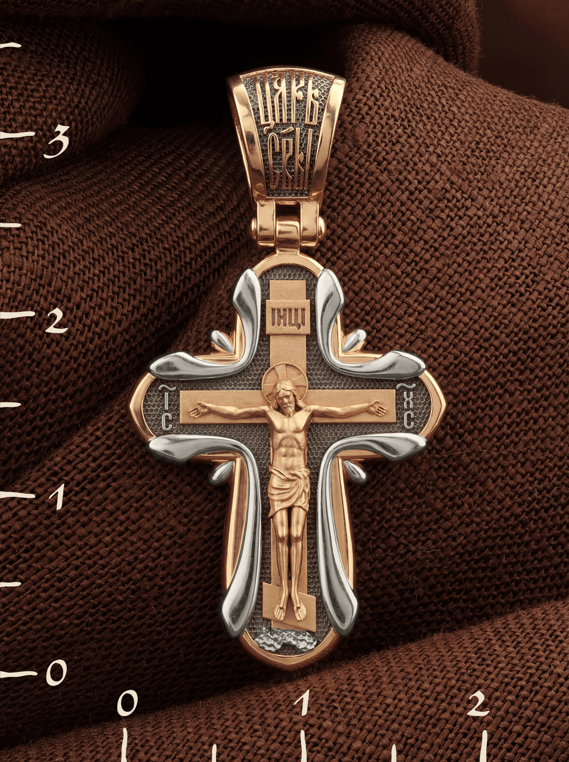 На лицевой стороне креста изображено Распятие Господа и Спасителя нашего Иисуса Христа, отдавшего Себя на смерть, для искупления грехов мира. Крест является символом жертвенной любви Всеблагого Бога к падшим людям, всепобеждающим духовным оружием христиан, основанием и средоточием церковной жизни. Господь сказал: кто хочет идти за Мною, отвергнись себя, и возьми крест свой, и следуй за Мною. (Мк. 8: 34). Над вершиной Распятия, на кулонном кольце, помещена надпись «Царь Славы». На верхней табличке, выше головы Иисуса, расположена надпись, составленная Понтием Пилатом — «IНЦI». Она означает «Иисус Назорей, Царь Иудейский». Надпись «IC» «ХC», означает Иисус Христос, помещается на разных сторонах поперечной перекладины креста. Крест стоит на горе камней, символизирующих Голгофу.