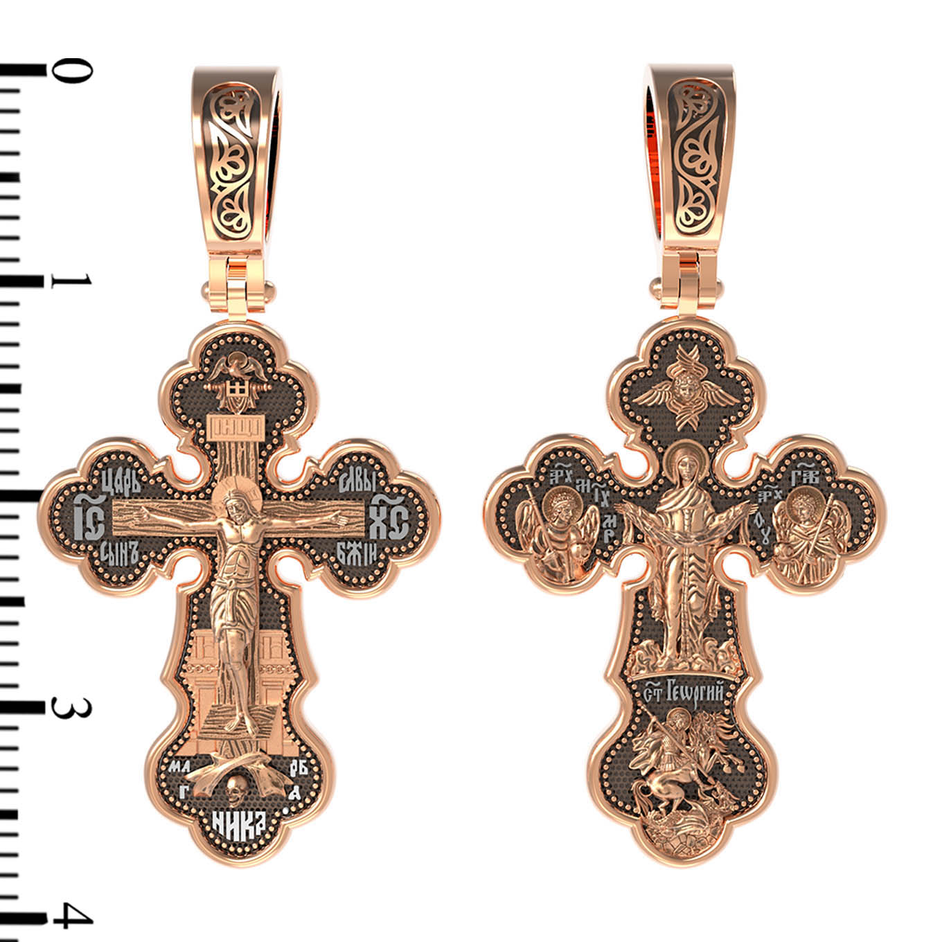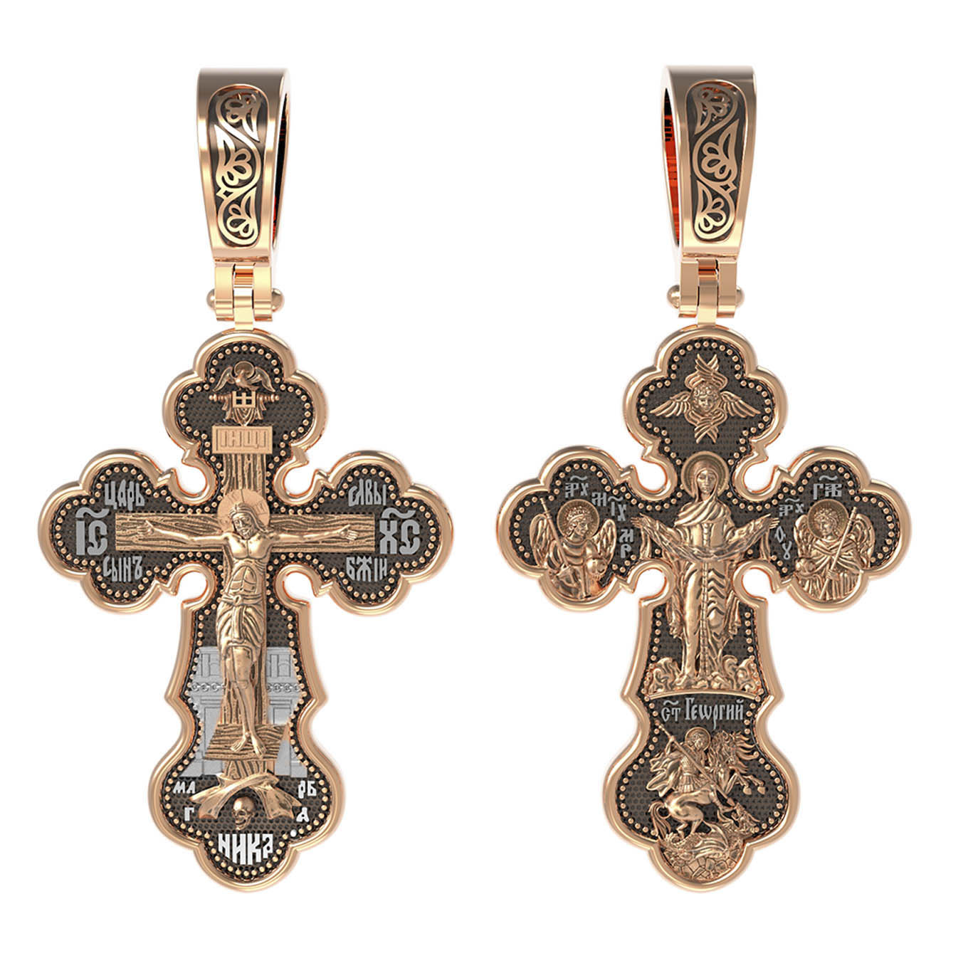 Центральную часть оборотной стороны креста украшает икона Божией Матери «Покров Пресвятой Богородицы». Праздник Покрова Пресвятой Богородицы пришел на Русь в XII веке из Византии и стал одним из самых почитаемых. Пресвятая Богородица простирает Свой молитвенный покров над всеми православными христианами и умоляет Сына своего о даровании вечного спасения каждому человеку. Над образом помещен шестикрылый Серафим. Справа помещено изображение Архангела Гавриила, слева- Архангела Михаила. На кресте внизу помещено изображение Святого Великомученика Георгия Победоносца — одного из самых почитаемых и удивительных святых. Он изображен как воитель, сидящий на вздыбленном коне и поражающий копьем огнедышащего змея. Змей символизирует собою сатанинские силы.