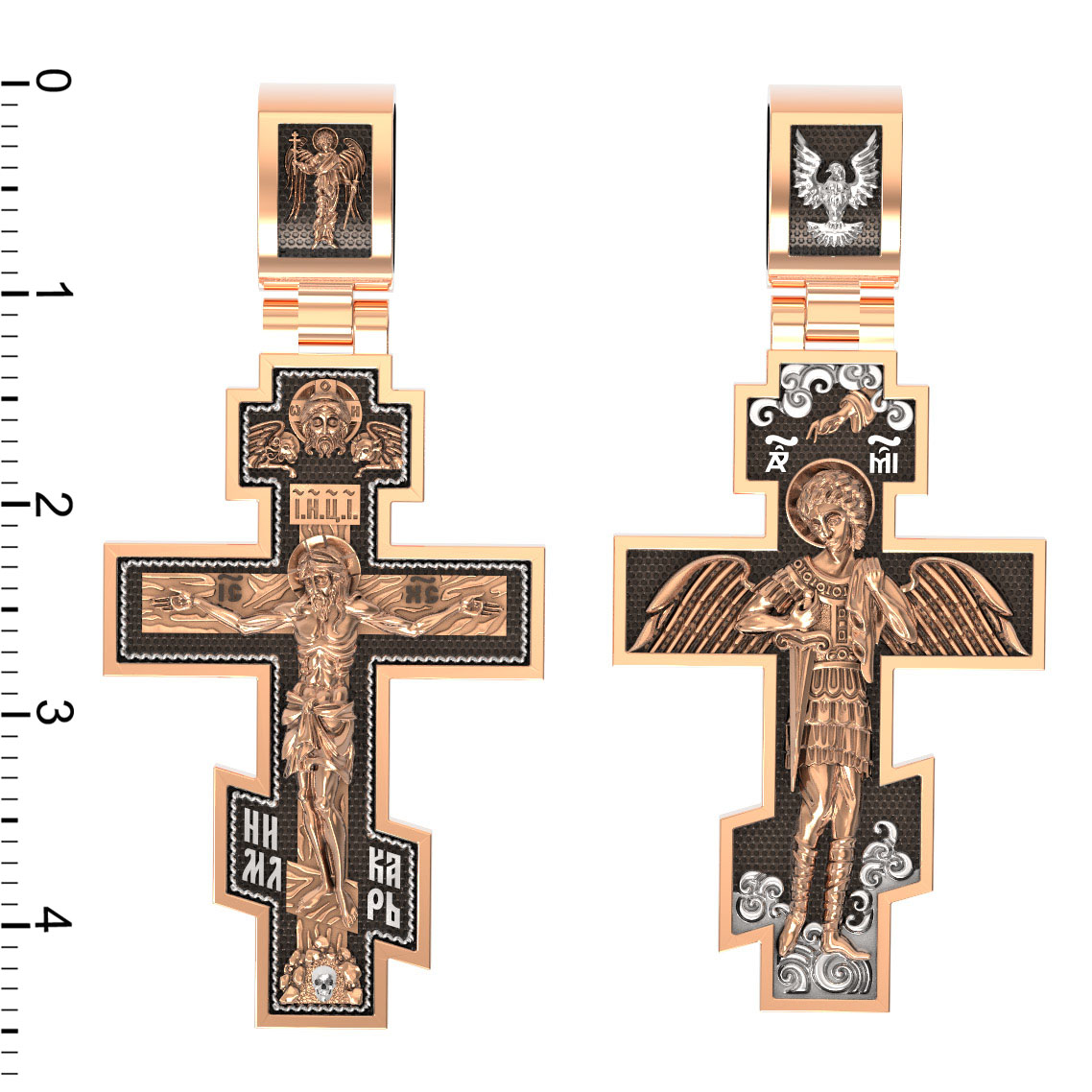 На оборотной стороне креста помещен Архангел Михаил, самый могущественный из ангелов. Это он низверг дьявола и встал во главе ангелов для борьбы с бесовскими силами. Его имя означает «Кто яко Бог?», так как он самый могучий и грозный враг зла. Древнерусские князья и воины стремились обрести покровительство Небесного Воеводы и нередко украшали свои шлемы его крылатой фигурой. На Руси также верили, что Архангел Михаил, как непримиримый враг дьявола, защищает и души умерших от бесовских нападений, провожая их на Небеса. Поэтому ему часто посвящались кладбищенские церкви.