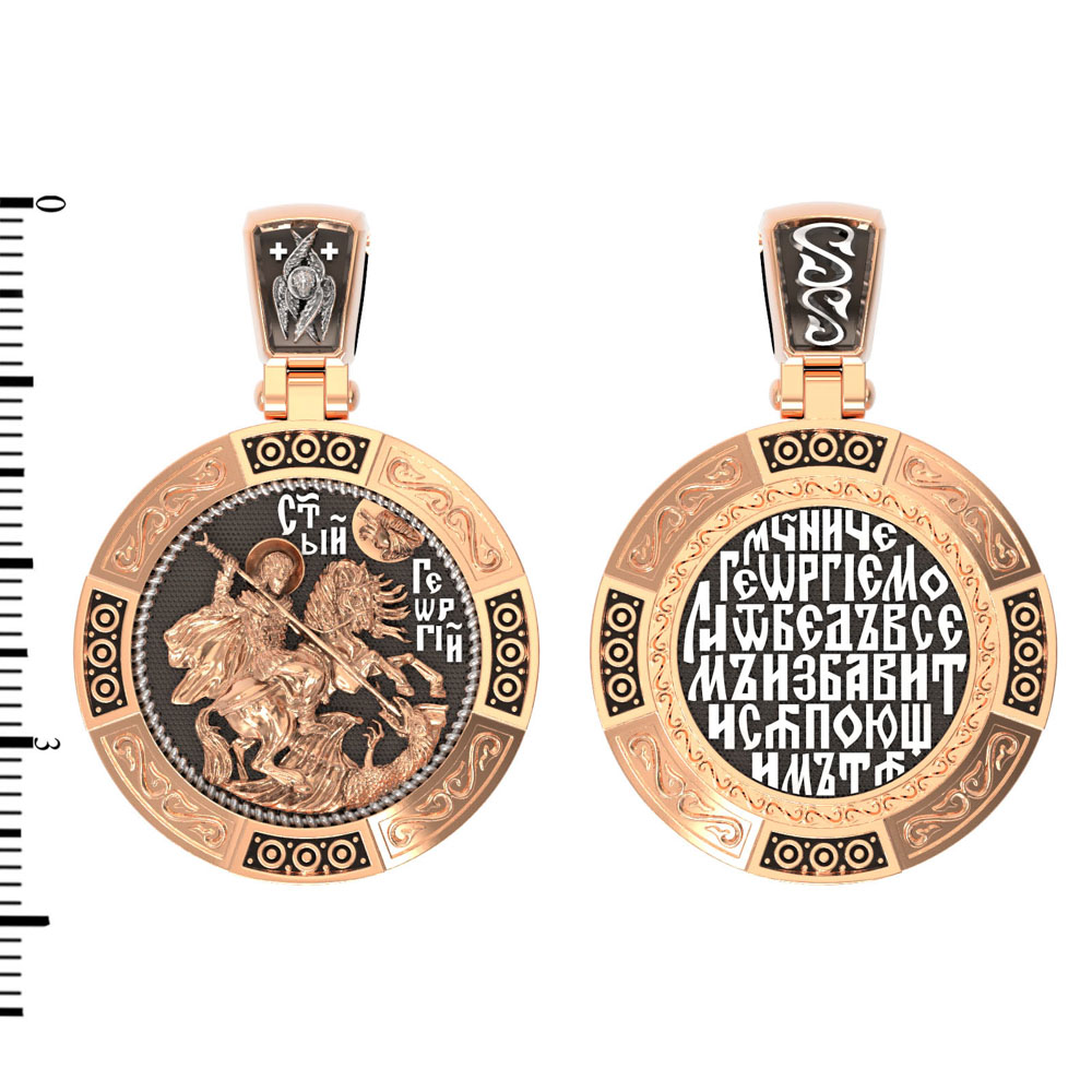На лицевой стороне изображен Святой Георгий Победоносец. Образ Великомученика считают одним из наиболее чтимых святынь в Святыни Православных, он олицетворяет собой заступника для верующих, чья жизнь имеет какое-либо отношение к военным делам, также он может оберегать и землевладельцев. Одно из самых великих чудес, которое сотворил Великомученик — это спасения всего города от устрашающего змия. Молитвами и своей непреклонной верой, взываемой к Всевышнему, он смог одолеть чудовище. Святой убил змея, спас жителей и их души от влияния дьявола, породив в них надежду и веру в Господа, призывая людей принять христианскую веру. Поскольку при жизни св. Георгий был военным, он считается покровителем всех, кто имеет отношение к армии — военнослужащим, участникам боевых действий. Молитва перед иконой Георгия Победоносца поможет защититься от врагов, одержать победу в сражении (военном, спортивном, духовной брани с дьяволом), содействие в установлении мира между членами семьи, избавиться от телесного недуга. На кулонном кольце изображен шестикрылый Серафим — самый приближенный к Господу Ангел.