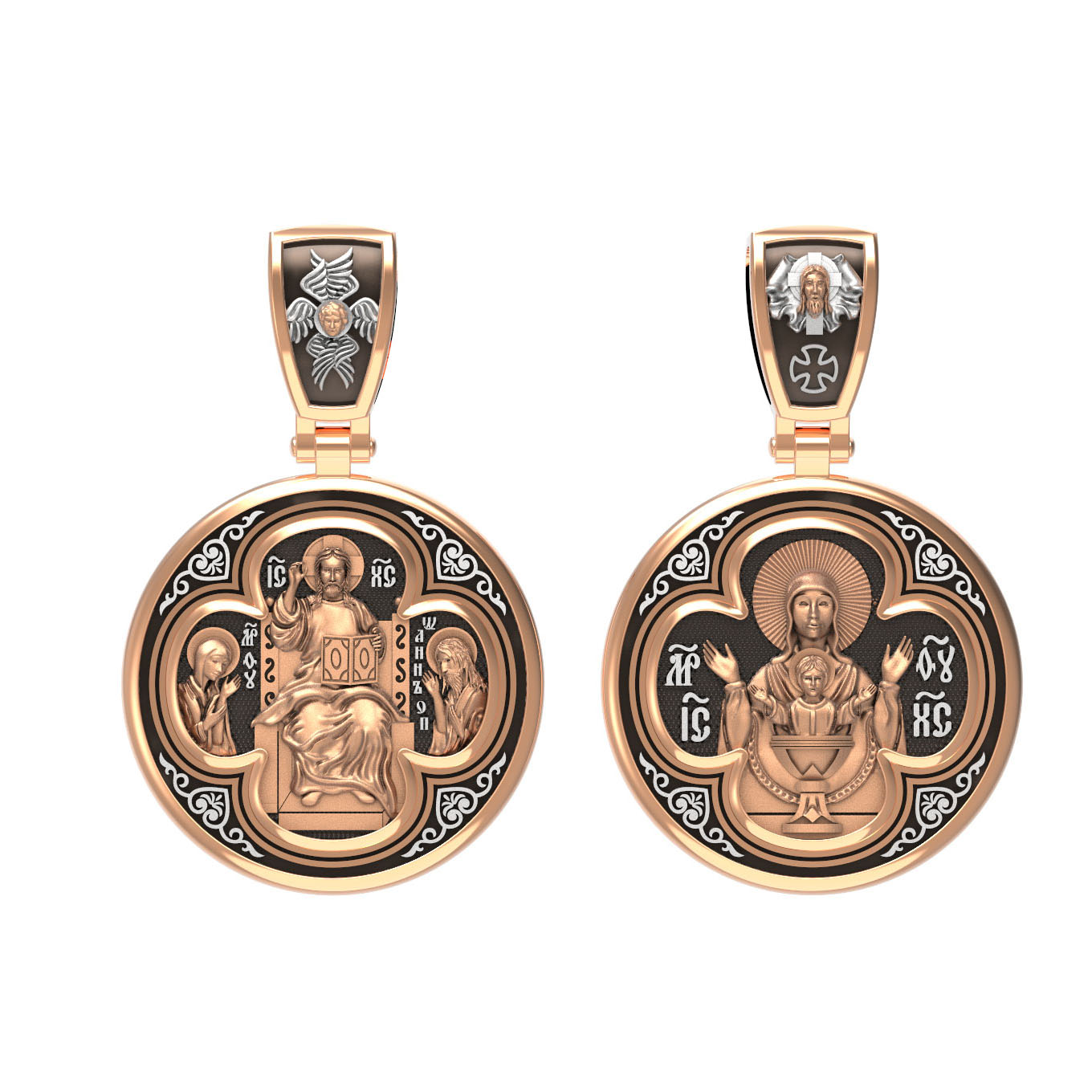 На лицевой стороне образка изображена икона Иисуса Христа Деисус. Он представлен в образе Господа Вседержителя, восседающего на престоле. В его руках — Книга Судеб всего человечества. С двух сторон ему предстоят Пресвятая Богородица и пророк Иоанн Предтеча, Креститель Господень.