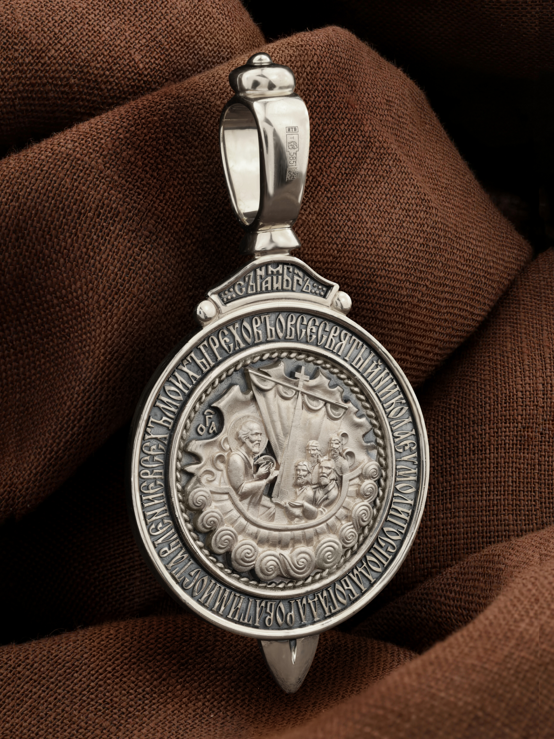На оборотной стороне образка изображен Святитель Николай Чудотворец, архиепископ Мир Ликийских. Он является одним из самых почитаемых святых в православном мире, издревле считающийся помощником и молитвенником за всех, притекающих к нему. Вся жизнь святого Николая — это служение Богу. Чудес его исчислить невозможно. Одним из чудес было спасение Святым Угодником Николаем погибающих во время шторма моряков. Они никогда не видели епископа города Миры, но слышали о его чудесной помощи. В отчаянии они молитвенно воззвали к нему, и тот неожиданно появился на корме у руля и благополучно привел корабль в гавань. Этот сюжет изображен на образке и обрамлен словами молитвы: « О всесвятый Николае, умоли Господа Бога даровати ми оставление всех моих грехов».
