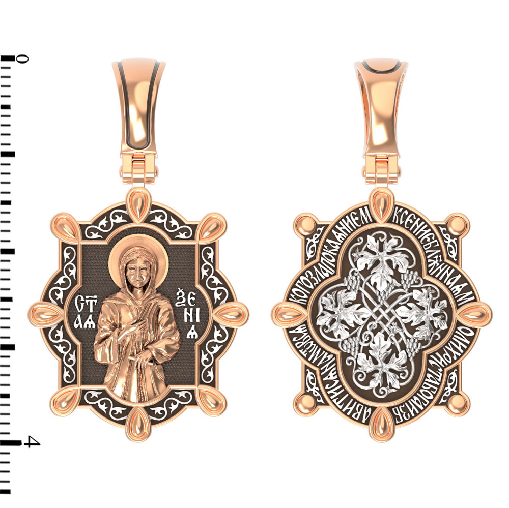 На оборотной стороне изображена виноградная лоза — символы церкви и евхаристии. «Я есмь лоза, — говорил Иисус Христос Своим ученикам, — а вы ветви; кто пребывает во Мне, и Я в нем, тот приносит много плода» (Ин. 15, 5), «Я есмь истинная виноградная лоза, а Отец Мой — виноградарь». Вокруг образка написана молитва: «Ксение блаженная, моли Христа Бога избавитися нам от всякаго зла покаянием».