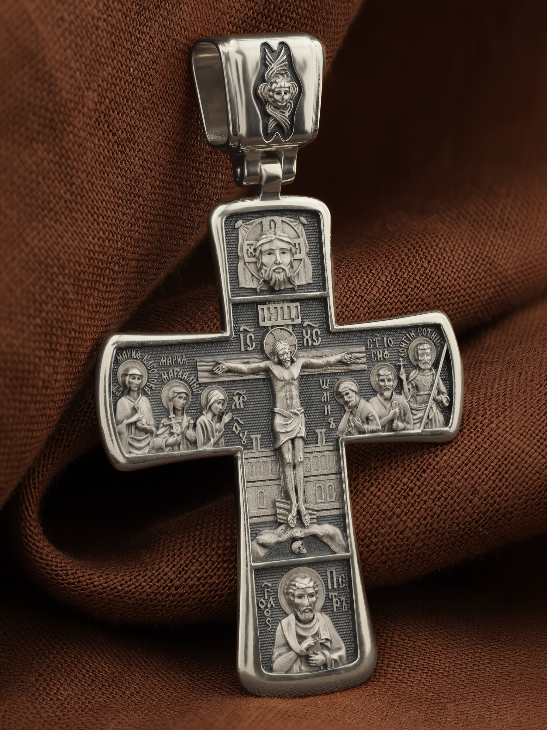 На лицевой стороне креста изображено Распятие Господа Иисуса Христа с предстоящими Ему святыми, которые, по преданию, находились у Креста Господа во время Его казни. Слева — Пресвятая Богородица и жены-мироносицы — равноапостольная Мария Магдалина и святая Мария Клеопова, справа — апостол Иоанн Богослов, прав. Иосиф Аримофейский и мч. Лонгин Сотник.