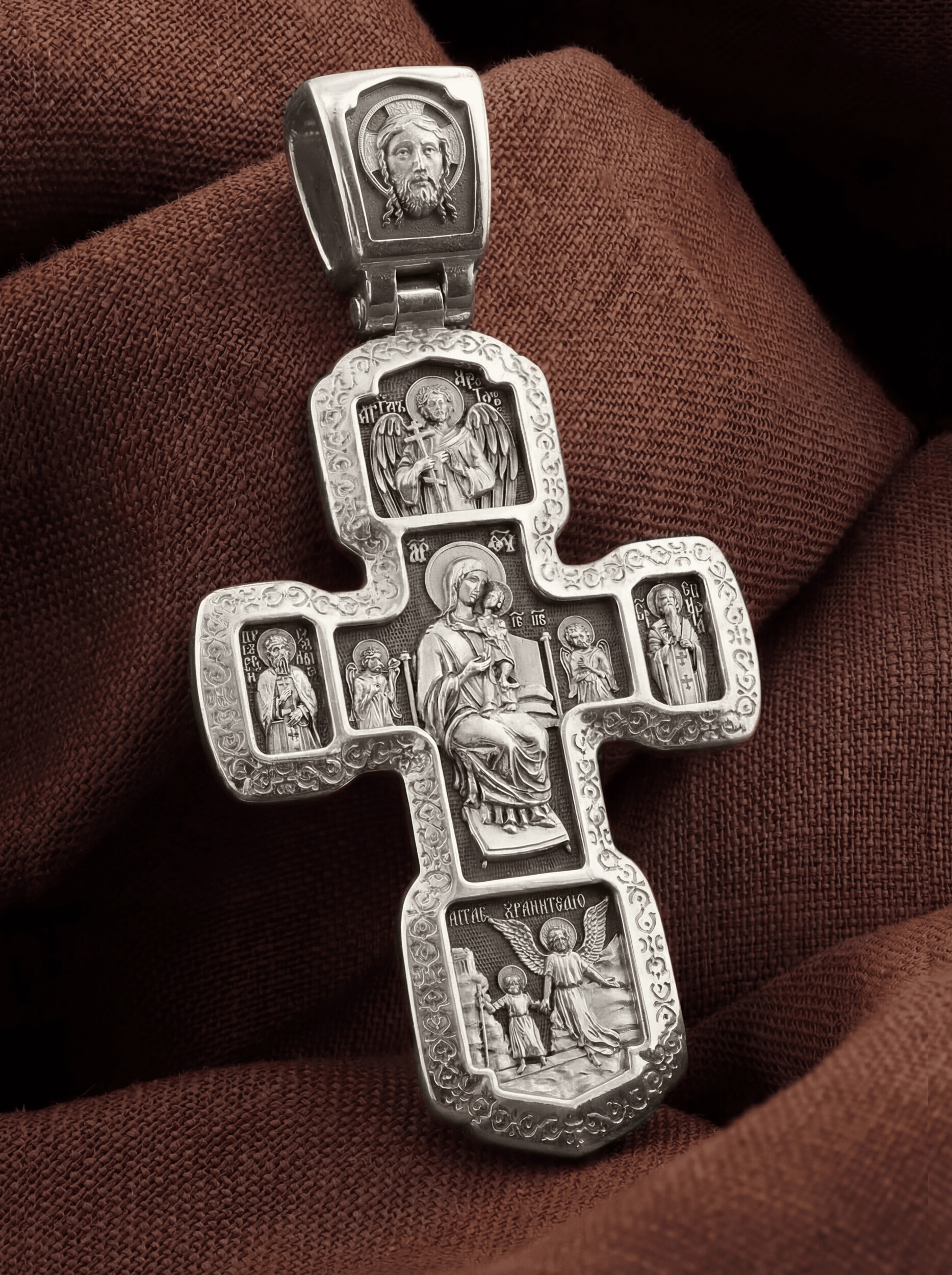Внизу изображены три святителя, творцы Божественной Литургии. В центре — святой Василий Великий, справа — святой Иоанн Златоуст, а слева — святой Григорий Богослов. В центральной части оборотной стороны Креста изображена икона Божией Матери «Всецарица» или «Пантанасса». Чудотворная икона была написана в XVII веке и находится на Святой Горе Афон. Икона совершила множество чудесных исцелений. Пречистая Богородица наставляет на праведный путь, помогает укрепить веру, найти утешение. По бокам изображены прп. Сергий Радонежский и святитель Спиридон Триумфунский. Сверху и снизу помещены изображения Ангела-Хранителя. На кулонном кольце помещено изображение Спаса Нерукотворного. Ему придается победное и защитное значение.