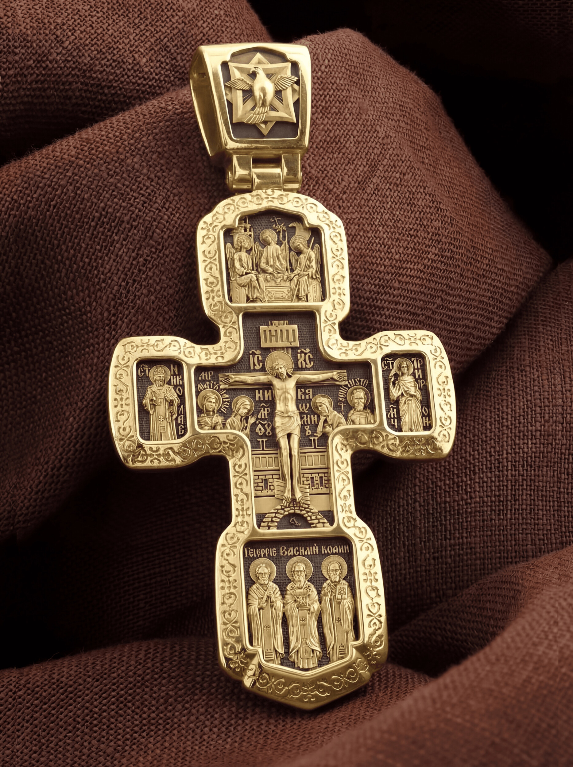 Внизу изображены три святителя, творцы Божественной Литургии. В центре — святой Василий Великий, справа — святой Иоанн Златоуст, а слева — святой Григорий Богослов. В центральной части оборотной стороны Креста изображена икона Божией Матери «Всецарица» или «Пантанасса». Чудотворная икона была написана в XVII веке и находится на Святой Горе Афон. Икона совершила множество чудесных исцелений. Пречистая Богородица наставляет на праведный путь, помогает укрепить веру, найти утешение. По бокам изображены прп. Сергий Радонежский и святитель Спиридон Триумфунский. Сверху и снизу помещены изображения Ангела-Хранителя. На кулонном кольце помещено изображение Спаса Нерукотворного. Ему придается победное и защитное значение.