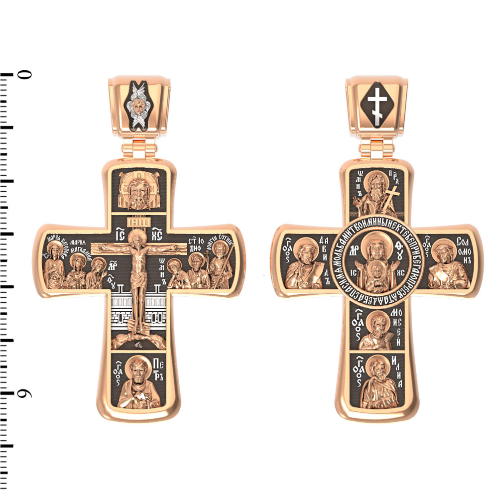 На лицевой стороне креста изображено Распятие Господа Иисуса Христа с предстоящими Ему святыми, которые, по преданию, находились у Креста Господа во время Его казни. Слева — Пресвятая Богородица и жены-мироносицы — равноапостольная Мария Магдалина и святая Мария Клеопова, справа — апостол Иоанн Богослов, прав. Иосиф Аримофейский и мч. Лонгин Сотник.