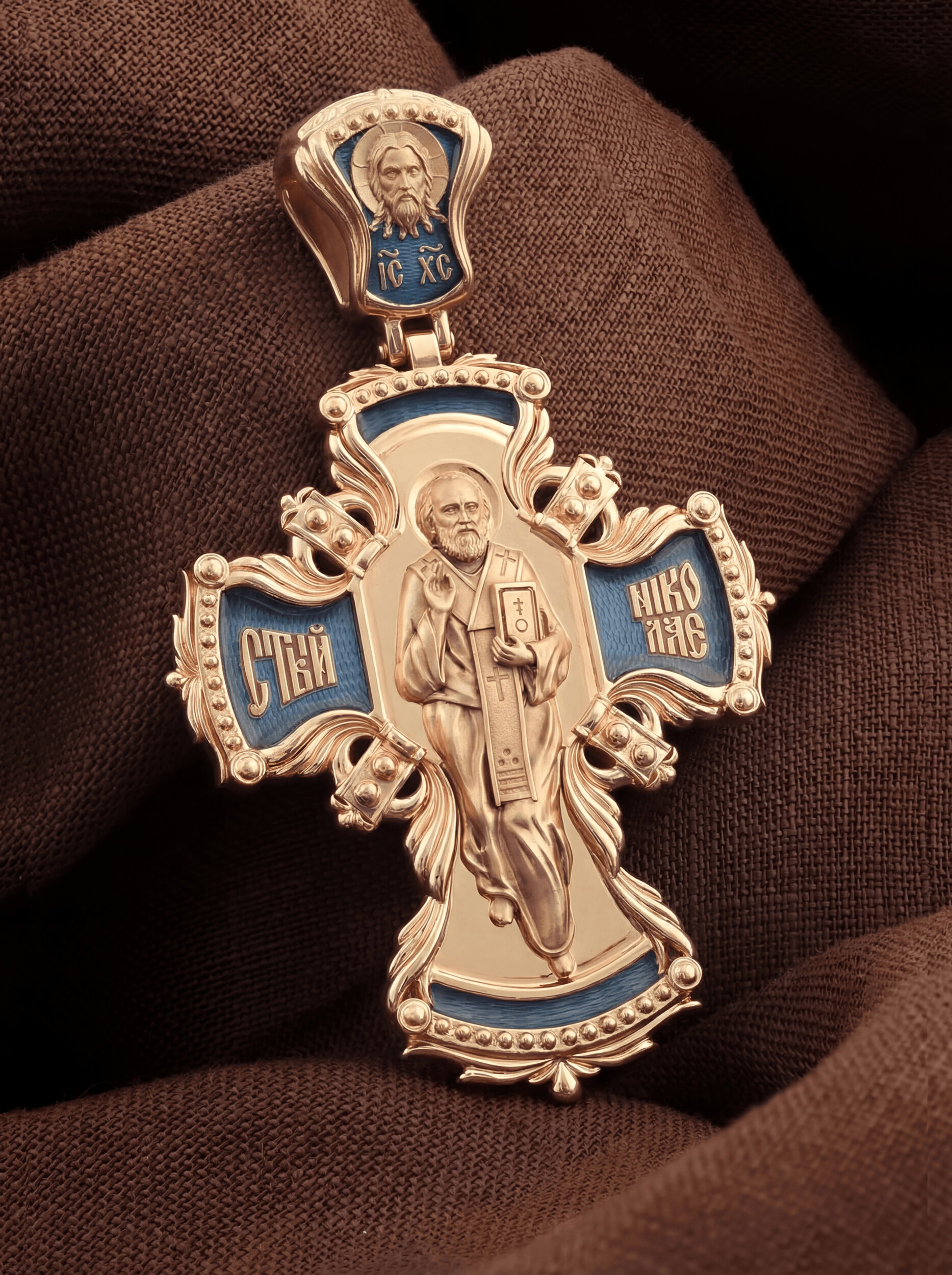 Оборотную сторону креста возглавляет икона святителя Николая Чудотворца, самого почитаемого святого не только в России, но и во всем мире. Николай Чудотворец, помощник в делах, защитник путешествующих, покровитель учащихся, утешитель обиженных и нуждающихся, целитель самых страшных и тяжелых недугов, предстатель и молитвенник за людей перед Богом. На кулонном кольце помещено изображение Спаса Нерукотворного — образ Спасителя, который Он запечатлел на плате и передал для исцеления больному проказой царю Эдессы.