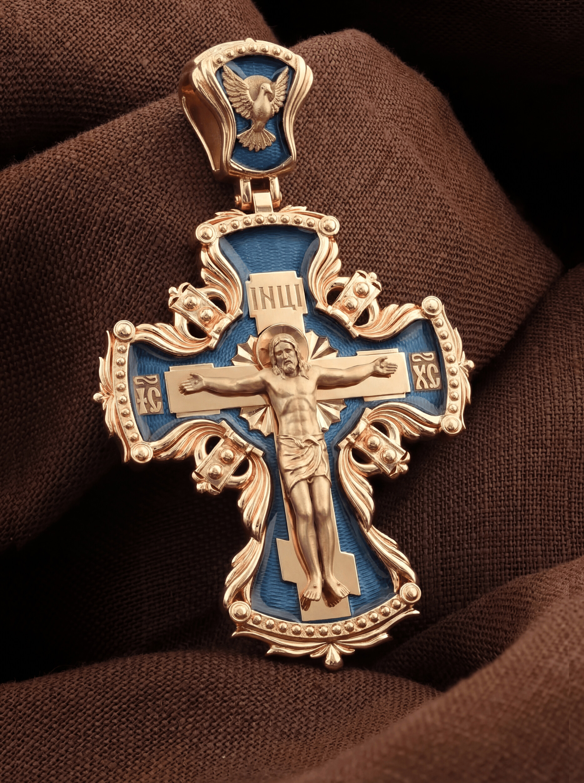 Центральную часть лицевой стороны занимает Распятие Христа — образ жертвы, принесенной Господом за грехи людей. Именно ко Христу, сошедшему на землю ради нашего спасения, возносятся все молитвы. Рядом с Его образом помещены слова — «НИКА» и «СЫН БОЖИЙ». Эти слова характеризуют Господа как Великого Архиерея, победителя смерти. Также Распятие сопровождается надписями, олицетворяющими Христа — это святое имя Христа «IC» (Иисус) «ХС» (Христос). На кулонном кольце изображен голуь — символ Святого Духа.