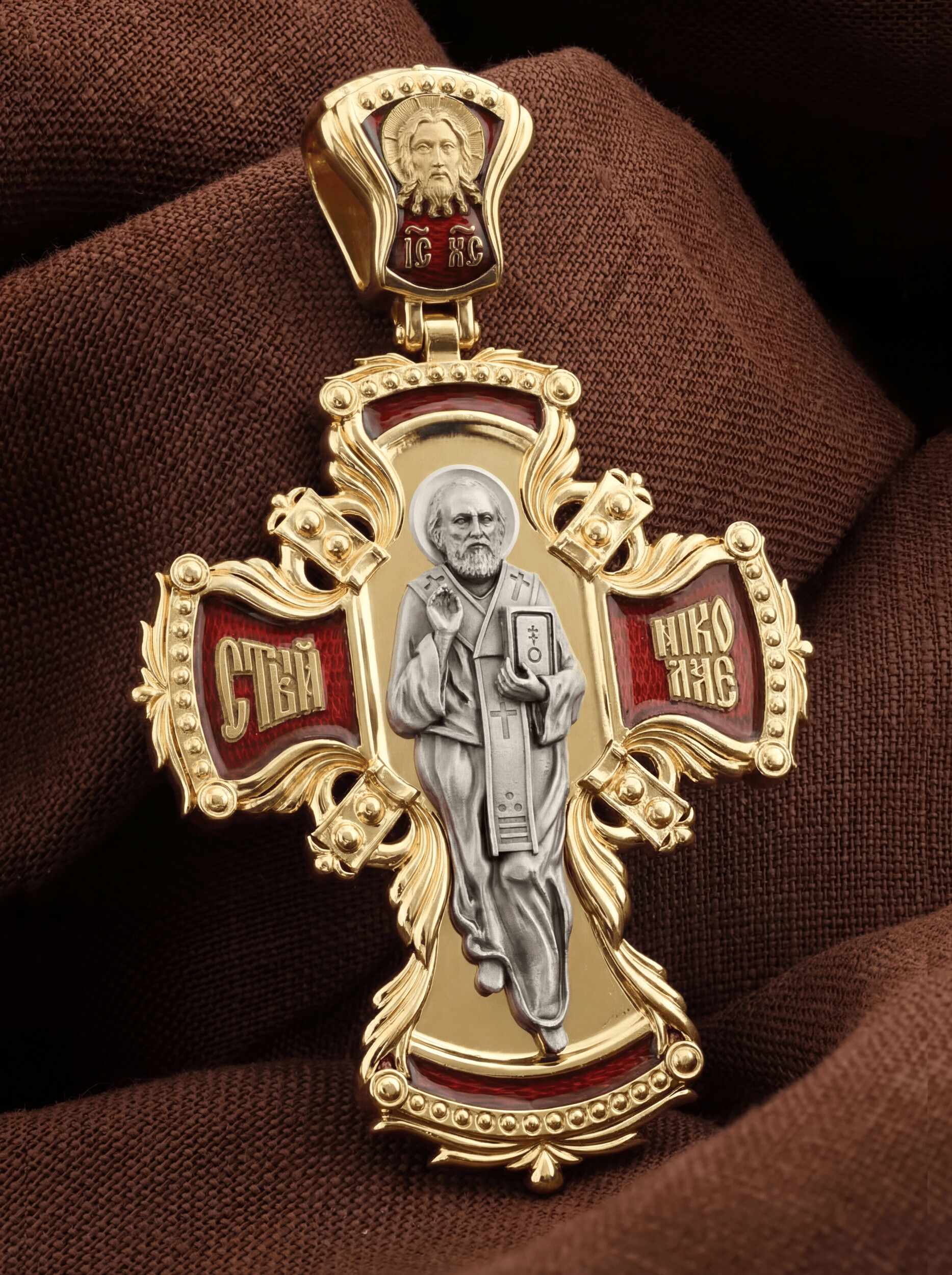 Оборотную сторону креста возглавляет икона святителя Николая Чудотворца, самого почитаемого святого не только в России, но и во всем мире. Николай Чудотворец, помощник в делах, защитник путешествующих, покровитель учащихся, утешитель обиженных и нуждающихся, целитель самых страшных и тяжелых недугов, предстатель и молитвенник за людей перед Богом. На кулонном кольце помещено изображение Спаса Нерукотворного — образ Спасителя, который Он запечатлел на плате и передал для исцеления больному проказой царю Эдессы.