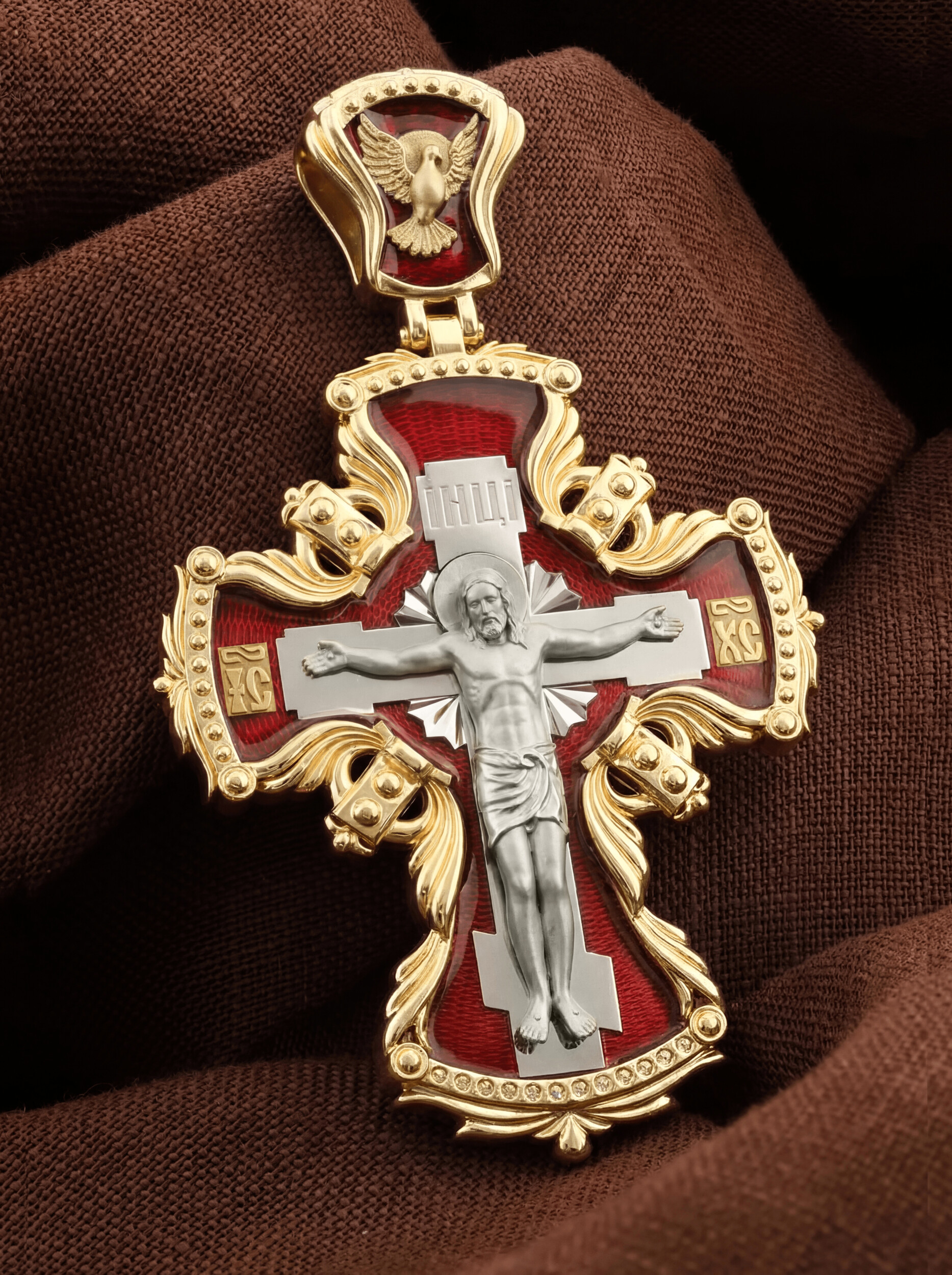 Центральную часть лицевой стороны занимает Распятие Христа — образ жертвы, принесенной Господом за грехи людей. Именно ко Христу, сошедшему на землю ради нашего спасения, возносятся все молитвы. Рядом с Его образом помещены слова — «НИКА» и «СЫН БОЖИЙ». Эти слова характеризуют Господа как Великого Архиерея, победителя смерти. Также Распятие сопровождается надписями, олицетворяющими Христа — это святое имя Христа «IC» (Иисус) «ХС» (Христос). На кулонном кольце изображен голуь — символ Святого Духа.