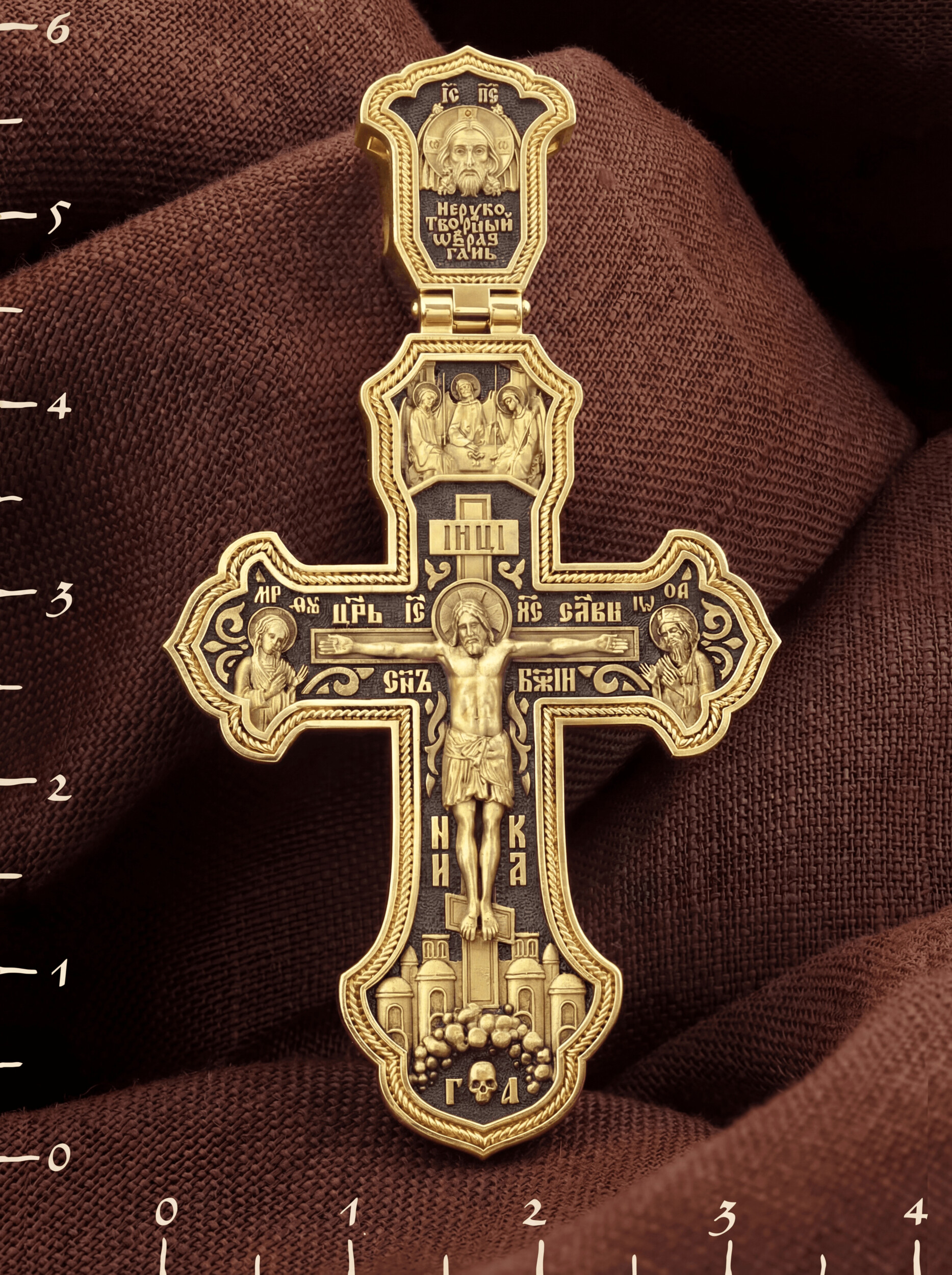 На лицевой стороне креста изображено Распятие Господа и Спасителя нашего Иисуса Христа, отдавшего Себя на смерть, для искупления грехов мира. Крест является символом жертвенной любви Всеблагого Бога к падшим людям, всепобеждающим духовным оружием христиан, основанием и средоточием церковной жизни. Господь сказал: кто хочет идти за Мною, отвергнись себя, и возьми крест свой, и следуй за Мною. (Мк. 8: 34). Над распятием помещена икона Святой Троицы, написанная преподобным Андреем Рублёвым в XV веке. На иконе изображены три ангела, являющихся образом Единосущного и Триипостасного Бога — Святой Троицы. На кулонном кольце изображен Нерукотворный образ Господа и Спасителя нашего Иисуса Христа. На верхней табличке, выше головы Иисуса, расположена надпись, составленная Понтием Пилатом — «IНЦI». Она означает «Иисус Назорей, Царь Иудейский». Надпись «IC» «ХC», означает Иисус Христос, помещается на разных сторонах поперечной перекладины креста. Рядом — слово «НИКА», что означает «победитель» и надпись «Царь Славы». Слева от Распятия изображена Пресвятая Богородица, справа — Про-рок Предтеча и Креститель Господень Иоанн. Ниже расположена надпись «Сын Божий». За крестом высится Иерусалимская стена, в знак того, что Господь был распят вне стен города. Крест стоит на горе камней, символизирующих Голгофу. В ее основании различается череп– это голова Адама.