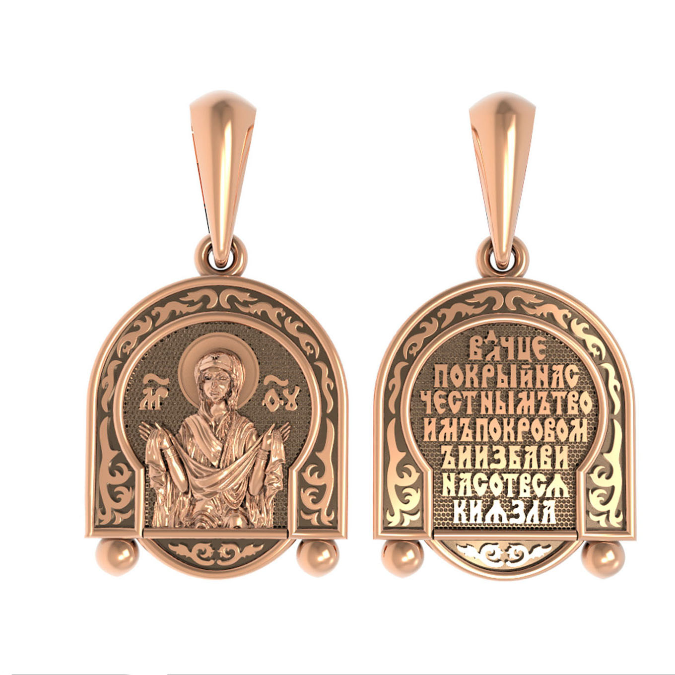 На лицевой части образка изображена икона Покров Пресвятой Богородицы. Праздник Покрова Божией Матери является воспоминанием чуда, которое произошло во Влахнернской церкви 1 (14) октября 910 года: Пресвятая Богородица явилась верующим над алтарем храма и распростерла над ними Свое покрывало. В этот день Божья Матерь открыла людям, что Она является Ходатаицей за них перед Богом. Богородица простирает Свой молитвенный покров над всеми православными христианами и умоляет Сына Своего о даровании вечного спасения каждому человеку.