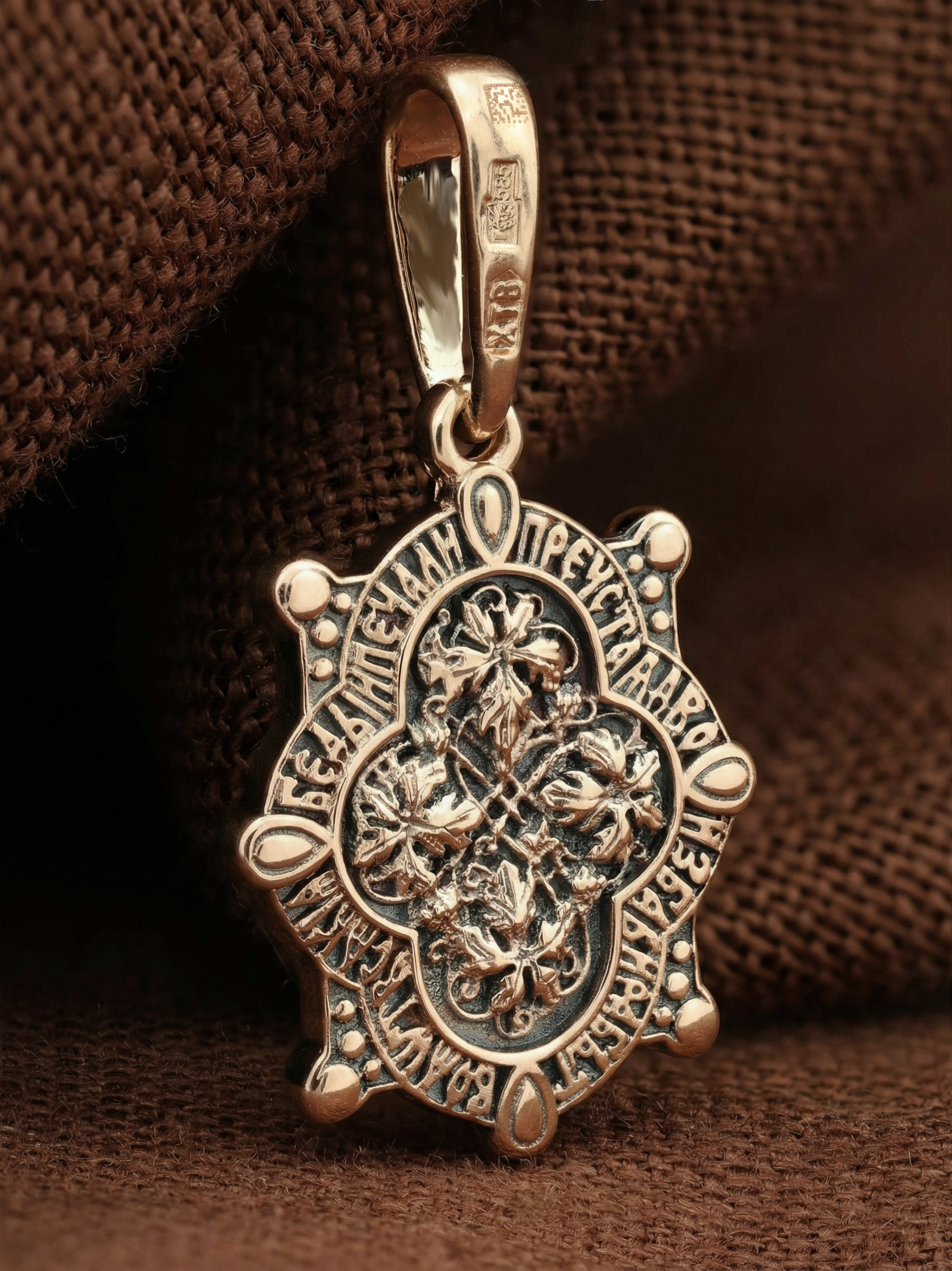 На лицевой стороне образка изображена икона Пресвятой Богородицы «Семистрельная» — одна из самых чудотворных икон на Руси. На протяжении многих веков христиане взывали к Царице Небесной через эту икону, если в стране начинались войны или мятежи.