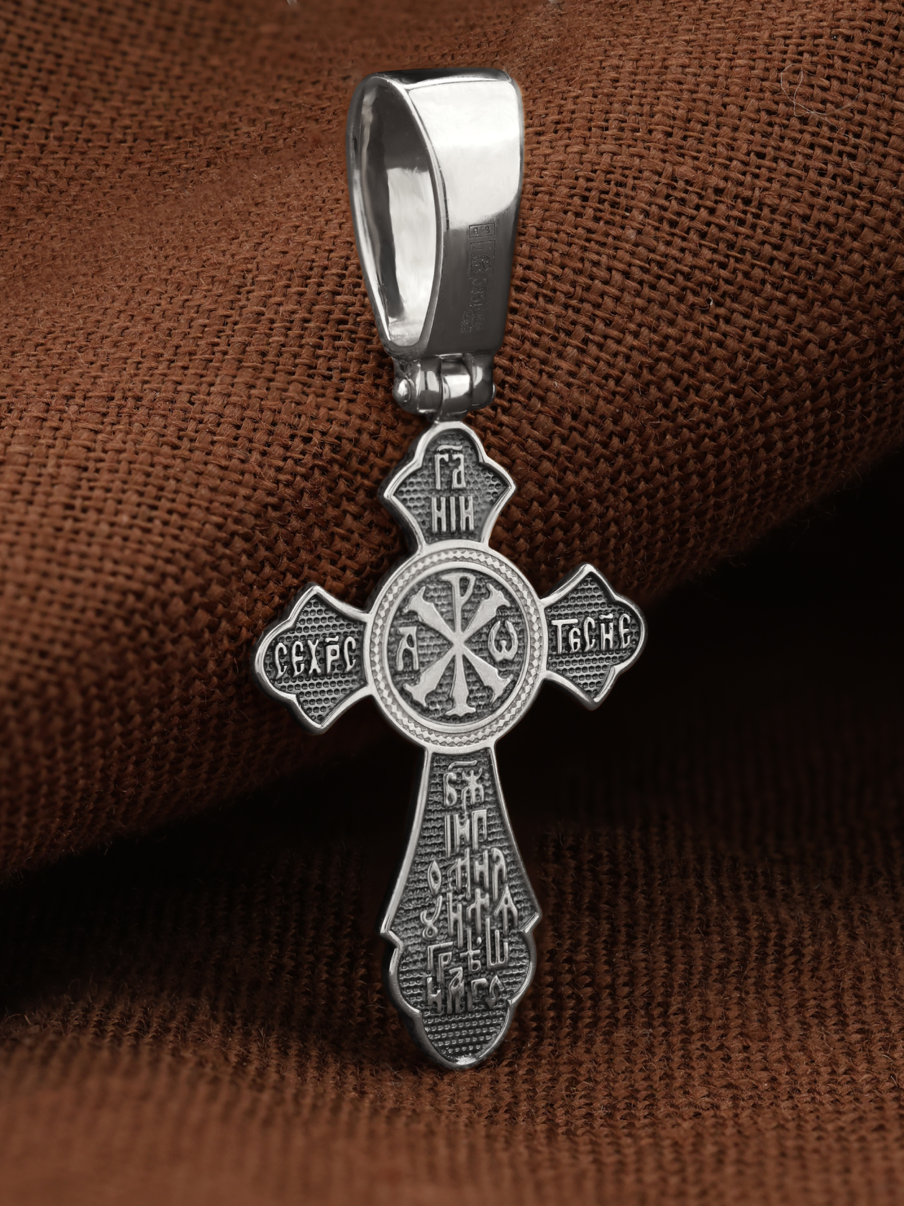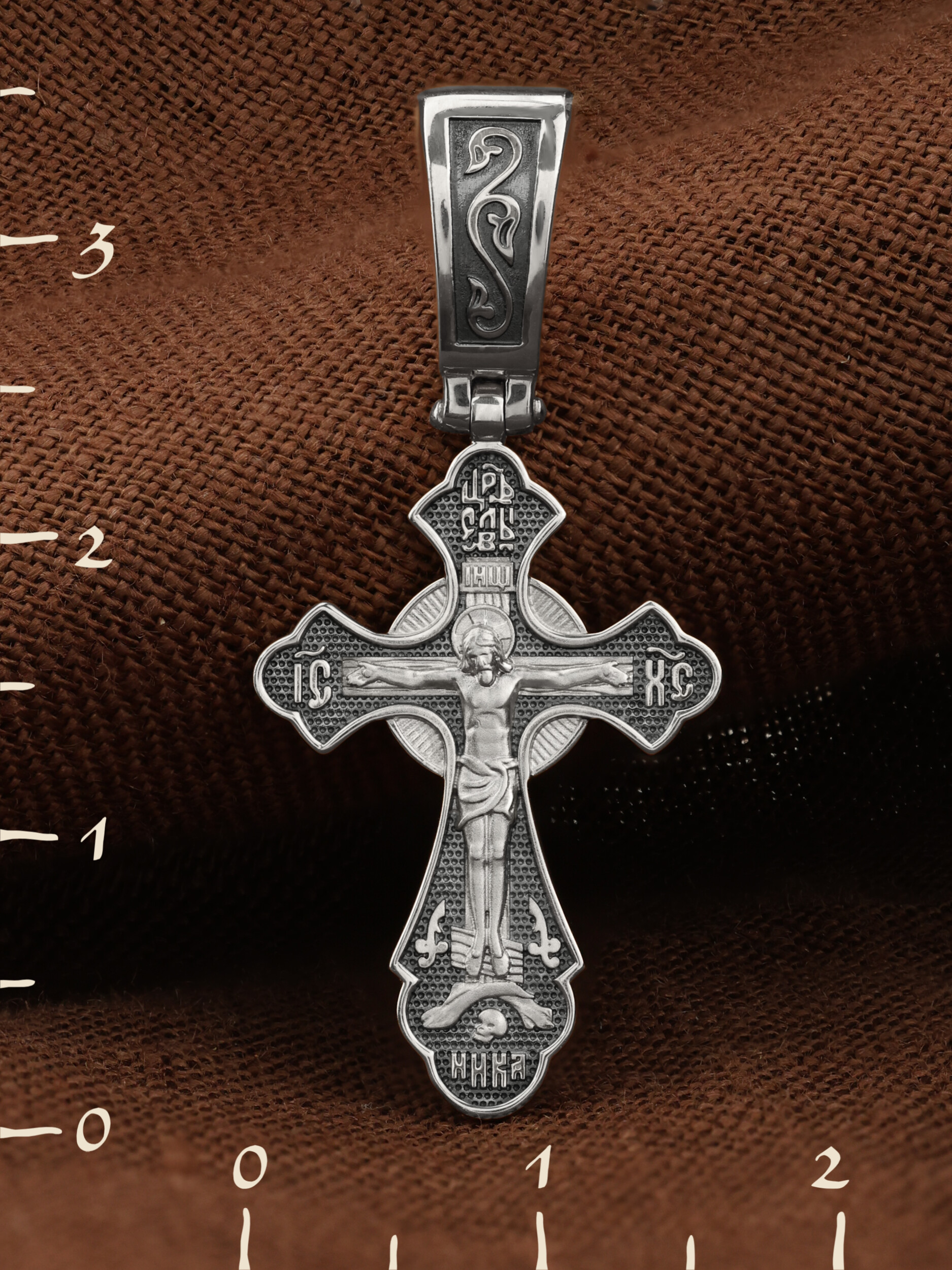 На лицевой стороне креста изображено Распятие, потому что это орудие казни Иисус Христос сделал орудием победы над грехом и смертью. Своими страданиями Он искупил грехи человечества, умерев и сошествовав во ад, победил сатану, освободил души праведников от вечной смерти и открыл им небесные врата рая. Жертва Христа сделала возможным спасение для каждого человека. На православном кресте Христос не умирает, а свободно простирает руки, ладони Иисуса открыты, будто он хочет обнять все человечество, даря им свою любовь и открывая путь к вечной жизни. Над титлом видим слова «ЦРЬ СЛВЫ» — Царь Славы. Верхняя перекладина символизирует собой табличку с надписью «IHЦI» — Иисус Назарянин Царь Иудейский. Над перекладиной пишется сокращенно имя Спасителя «IC XC» — Иисус Христос. В нижней части располагается надпись «НИКА» (греч. — Победитель). Возвышение, на котором стоит Крест, символизирует гору Голгофу, на которой произошло Распятие. У подножия Креста изображают прах Адама, обозначенный черепом.