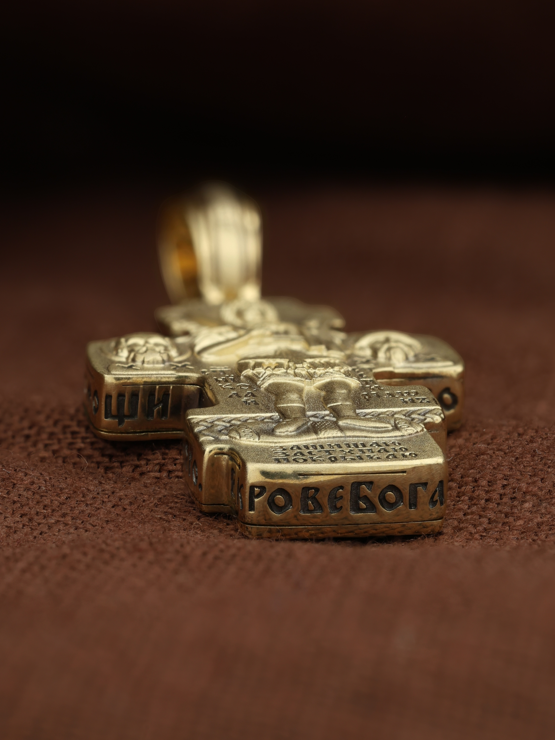 На лицевой стороне креста изображено Распятие Господа и Спасителя нашего Иисуса Христа. Крест- символ спасения и искупления рода человеческого, знамение победы над смертью и адом. Иисус Христос, как искупительная жертва освобождения человечества от власти греха, умер крестной смертью и в третий день воскрес. Над вершиной Распятия помещена надпись «Царь Славы». На верхней табличке, выше головы Иисуса, расположена надпись, составленная Понтием Пилатом — «IНЦI». Она означает «Иисус Назорей, Царь Иудейский». Надпись «IC» «ХC», означает Иисус Христос, помещается на разных сторонах поперечной перекладины креста. Под ней помещено слово «НIКА», что означает Победитель. Крест стоит на горе камней, символизирующих Голгофу, которая обозначена надписью «Г Г». В ее основании различается череп — это голова Адама, обозначенный надписью «Г А». Надпись «МЛРБ» — «место лобное рай бысть» означает место лобное стало раем. Вдоль креста изображены орудия Страстей Христовых: копие сотника Лонгина, которым пронзили подреберье мёртвого Иисуса, чтобы убедиться в Его смерти, и трость с губкой, с которой Иисуса напоили уксусом. Они обозначены буквами «К» и «Т».
