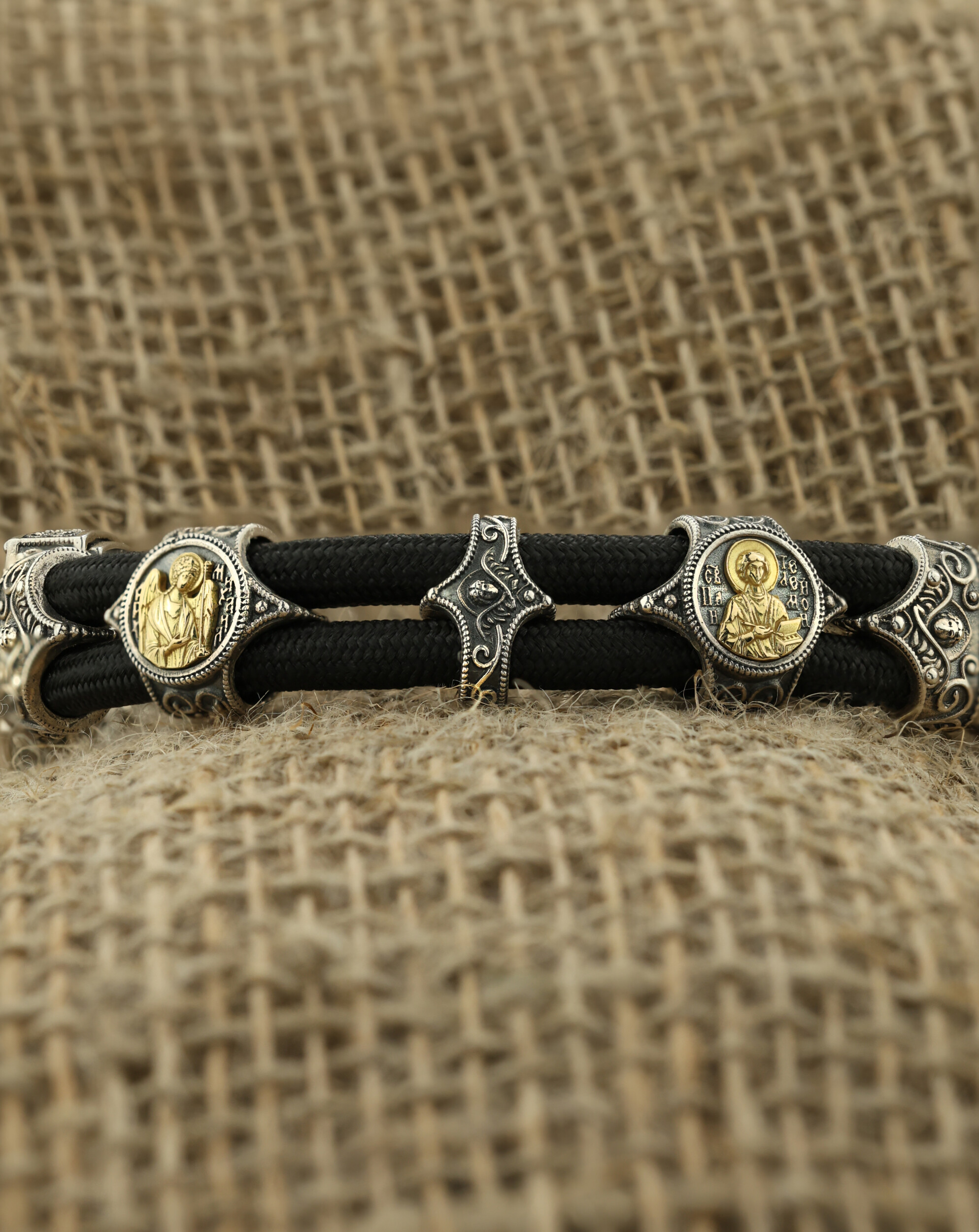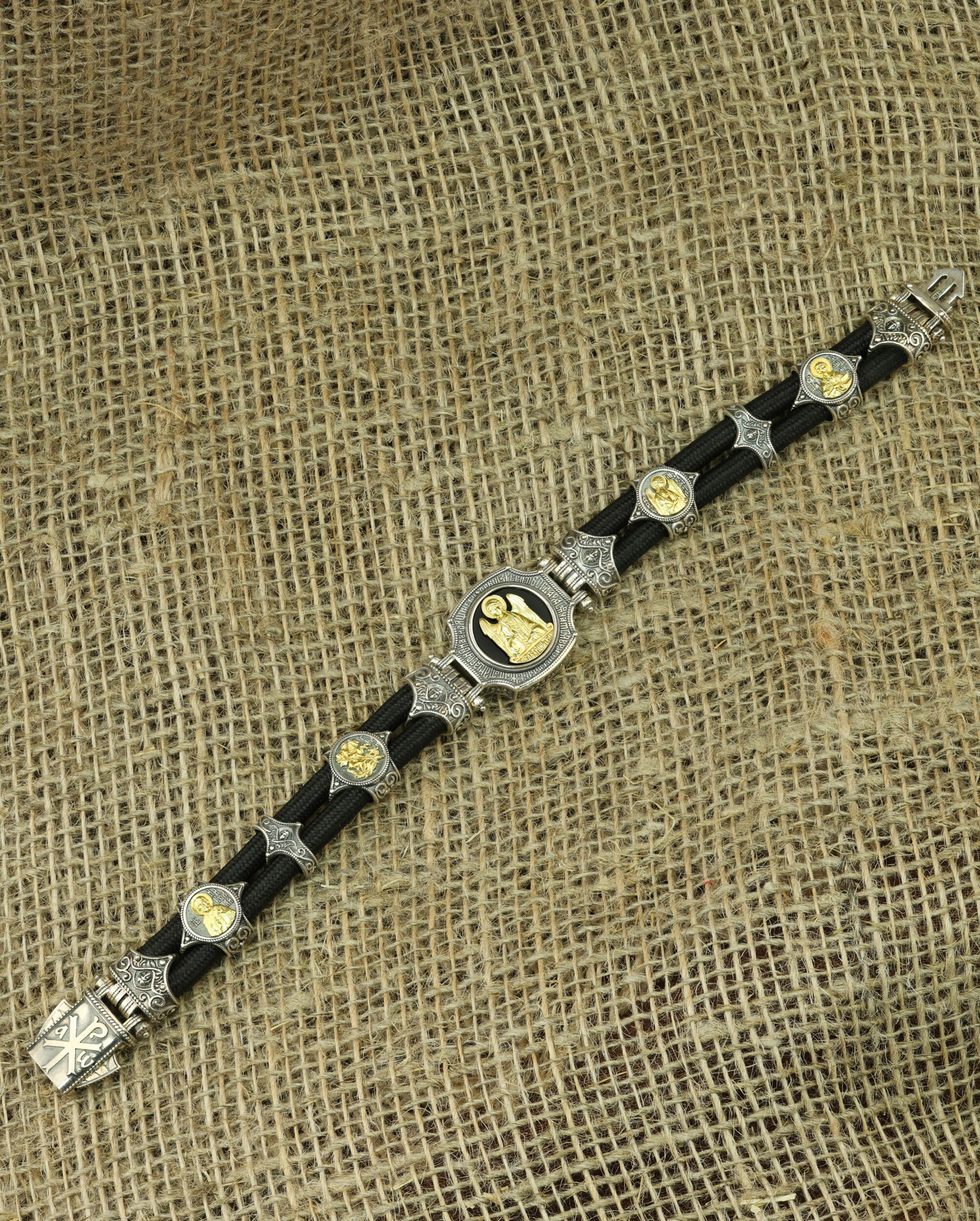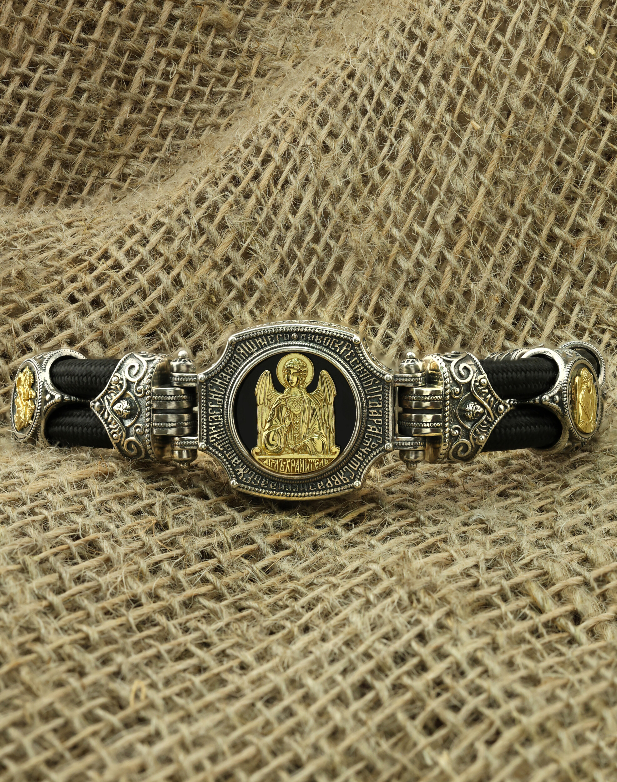 Браслет из серебра и золота c ониксом и шёлковым шнурком