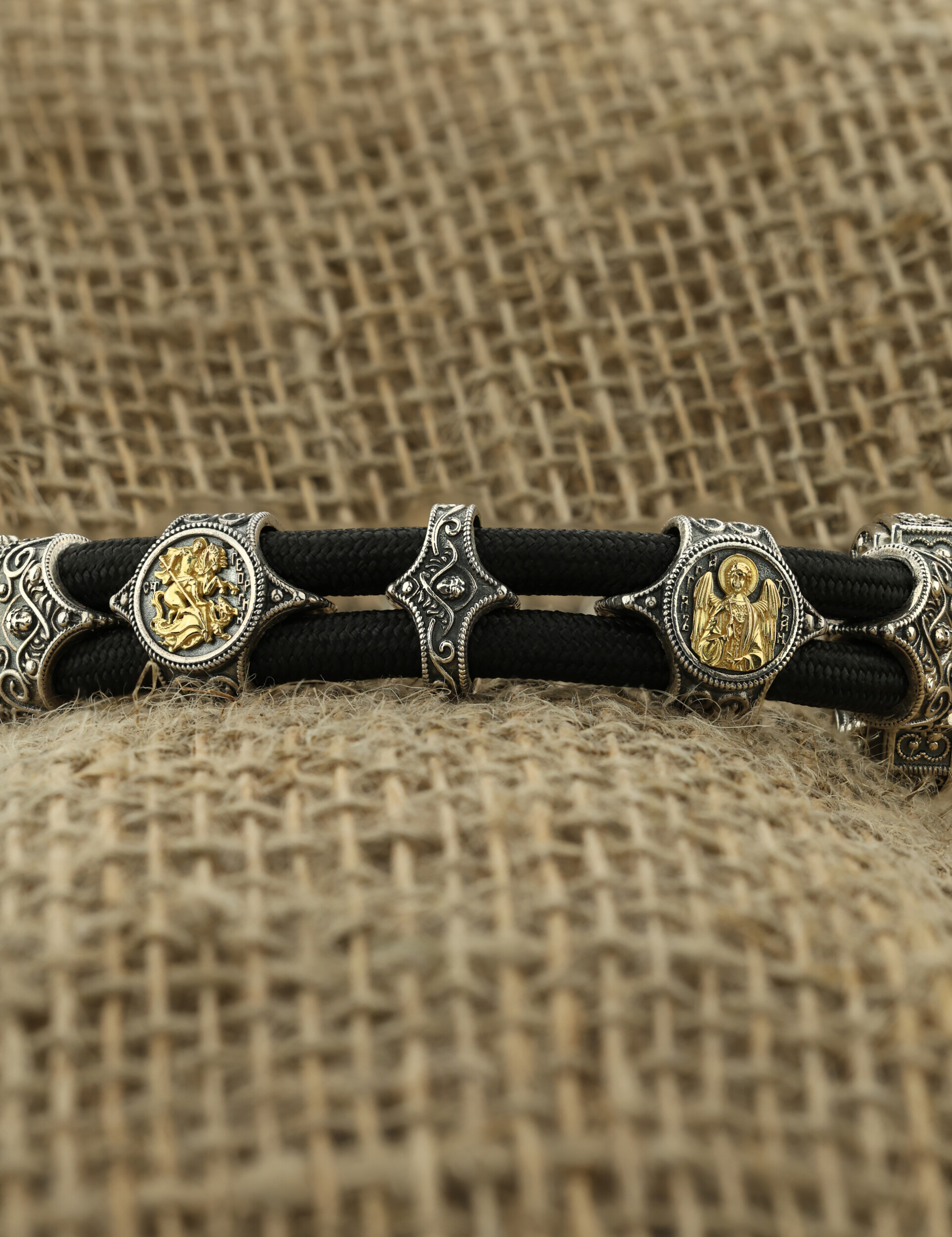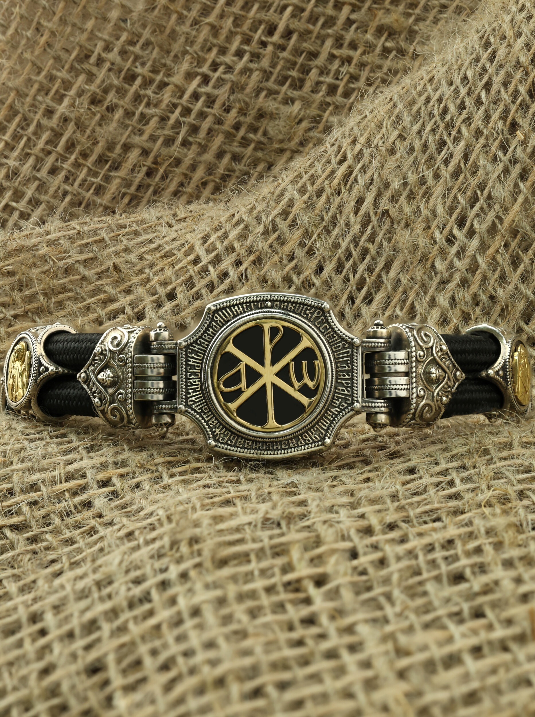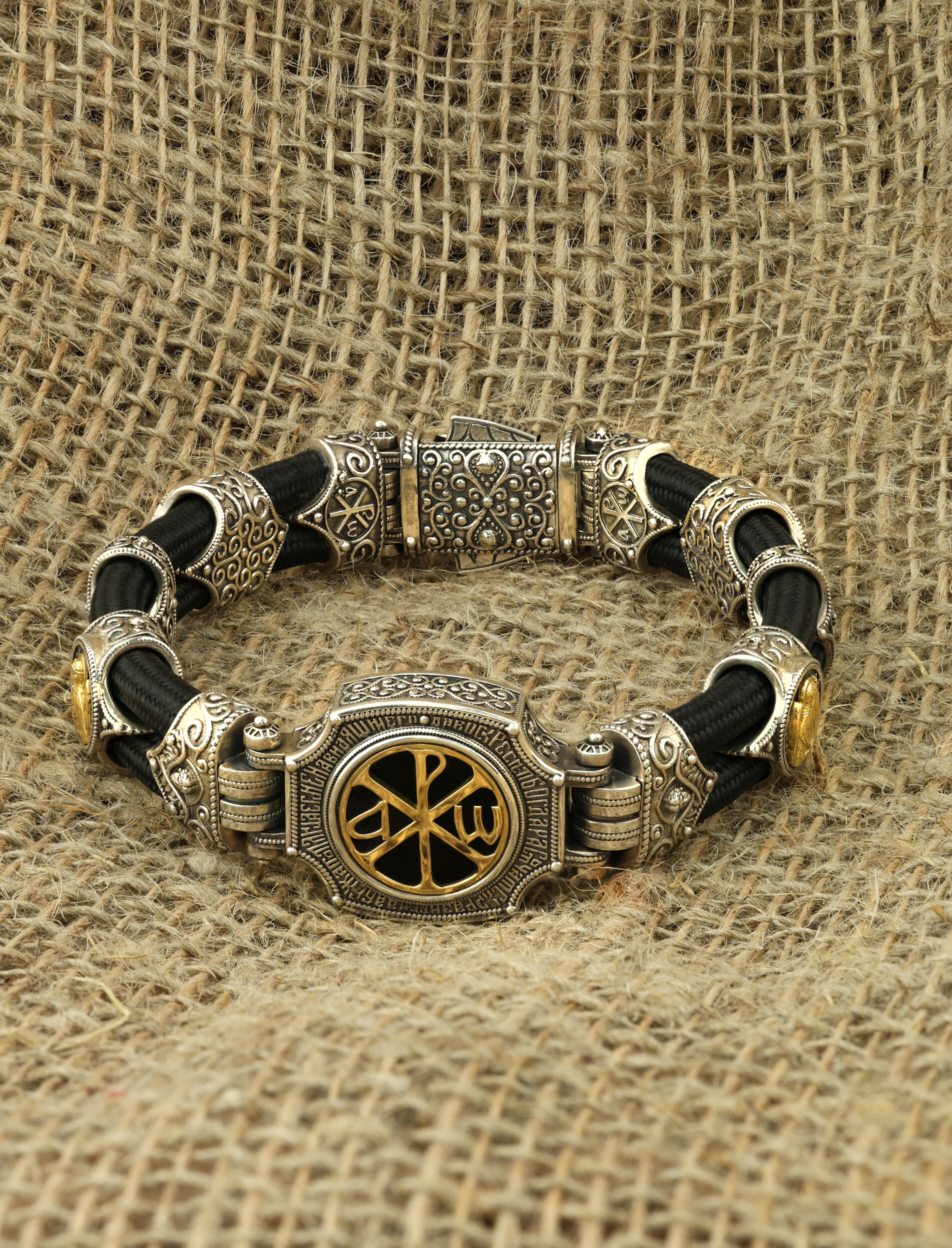 Браслет из серебра и золота c ониксом и шёлковым шнурком