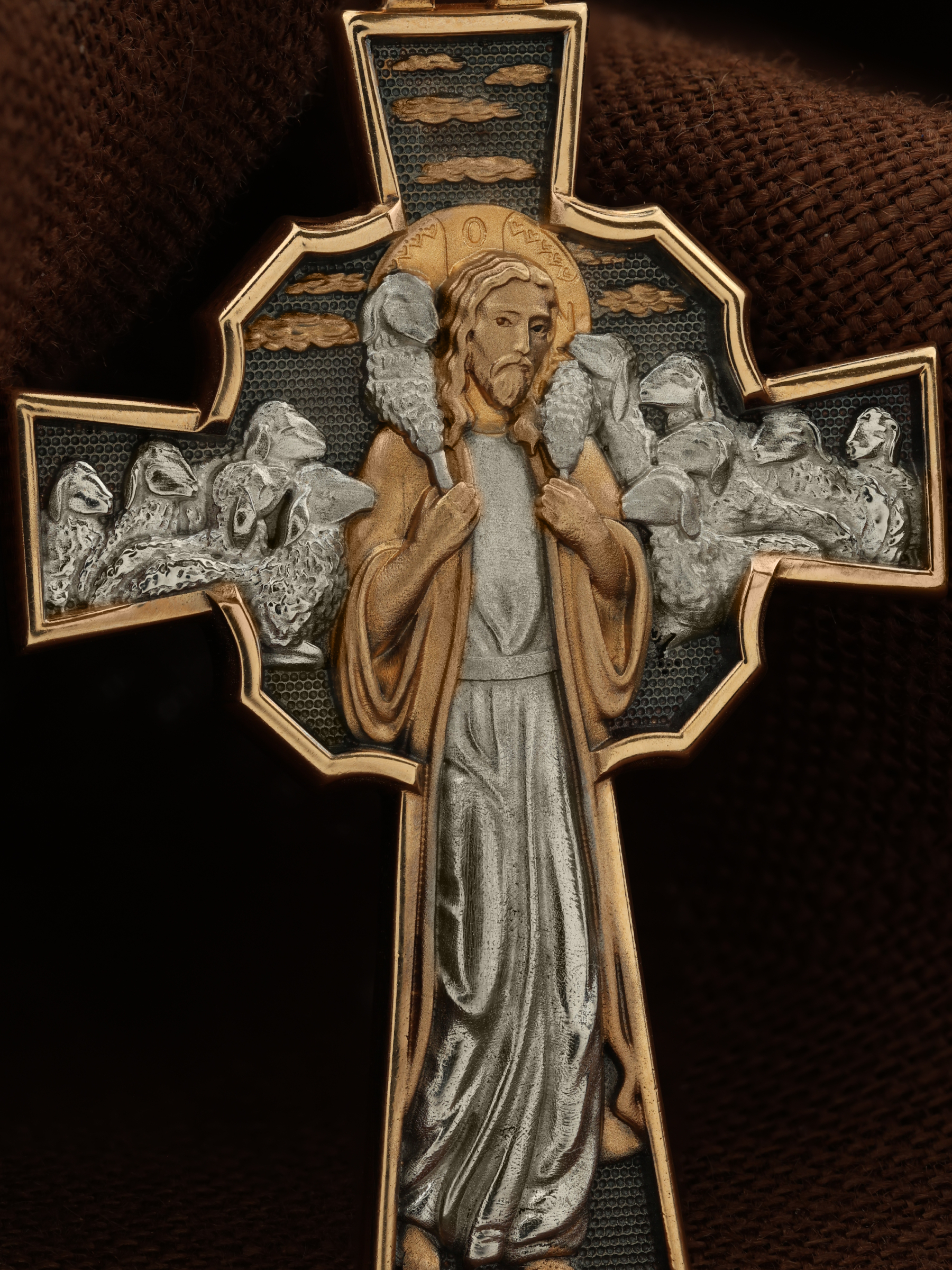 Но обратной стороне креста изображение Иисуса Христа. Добрый Пастырь — символическое именование и изображение Иисуса Христа, заимствованное из Ветхого Завета и повторенное Христом в Новом Завете в своей роли учителя. Иисус изображается с заблудшей овцой, вскинутой на плечи (Лк. 15:3−7).
