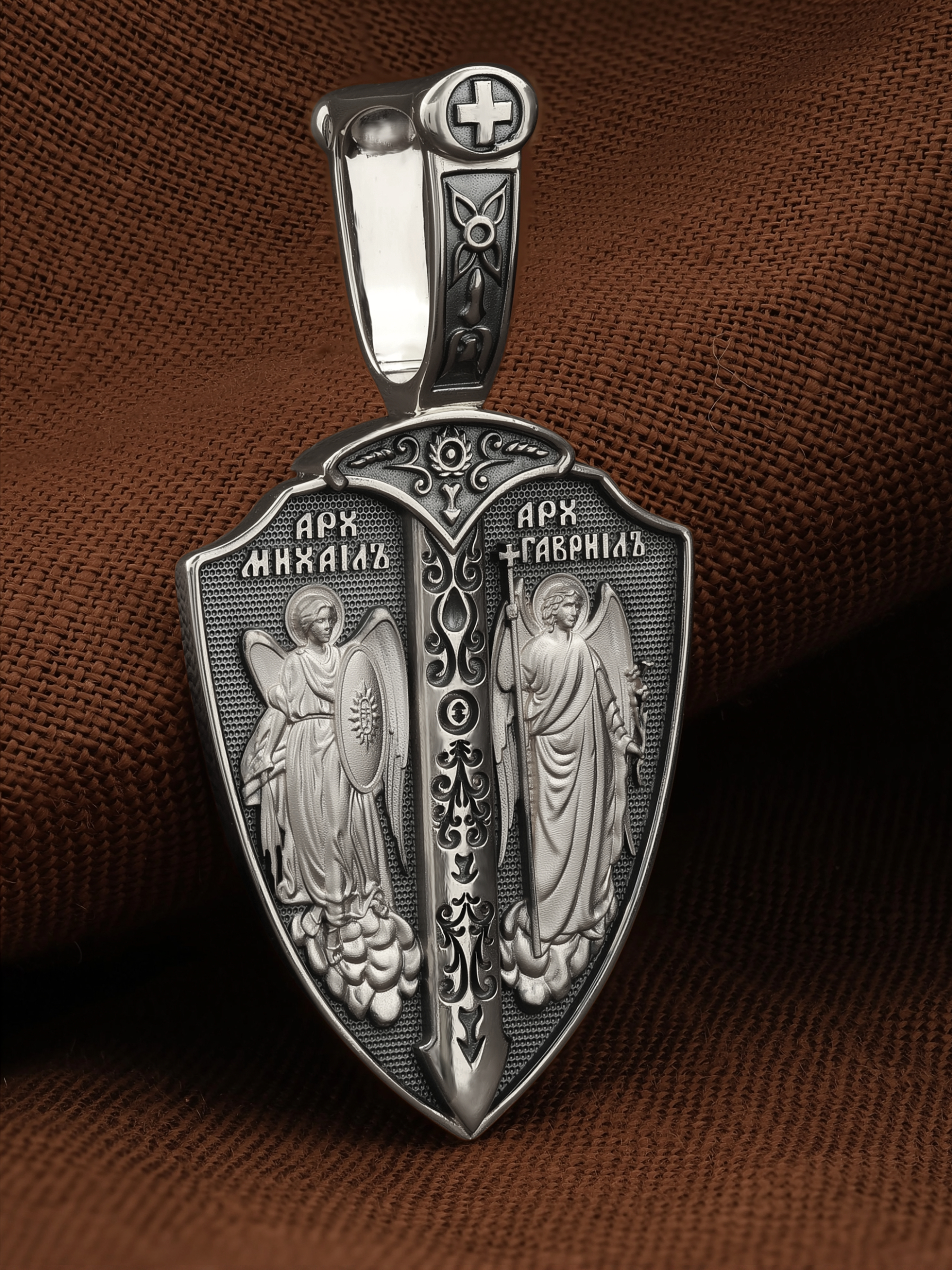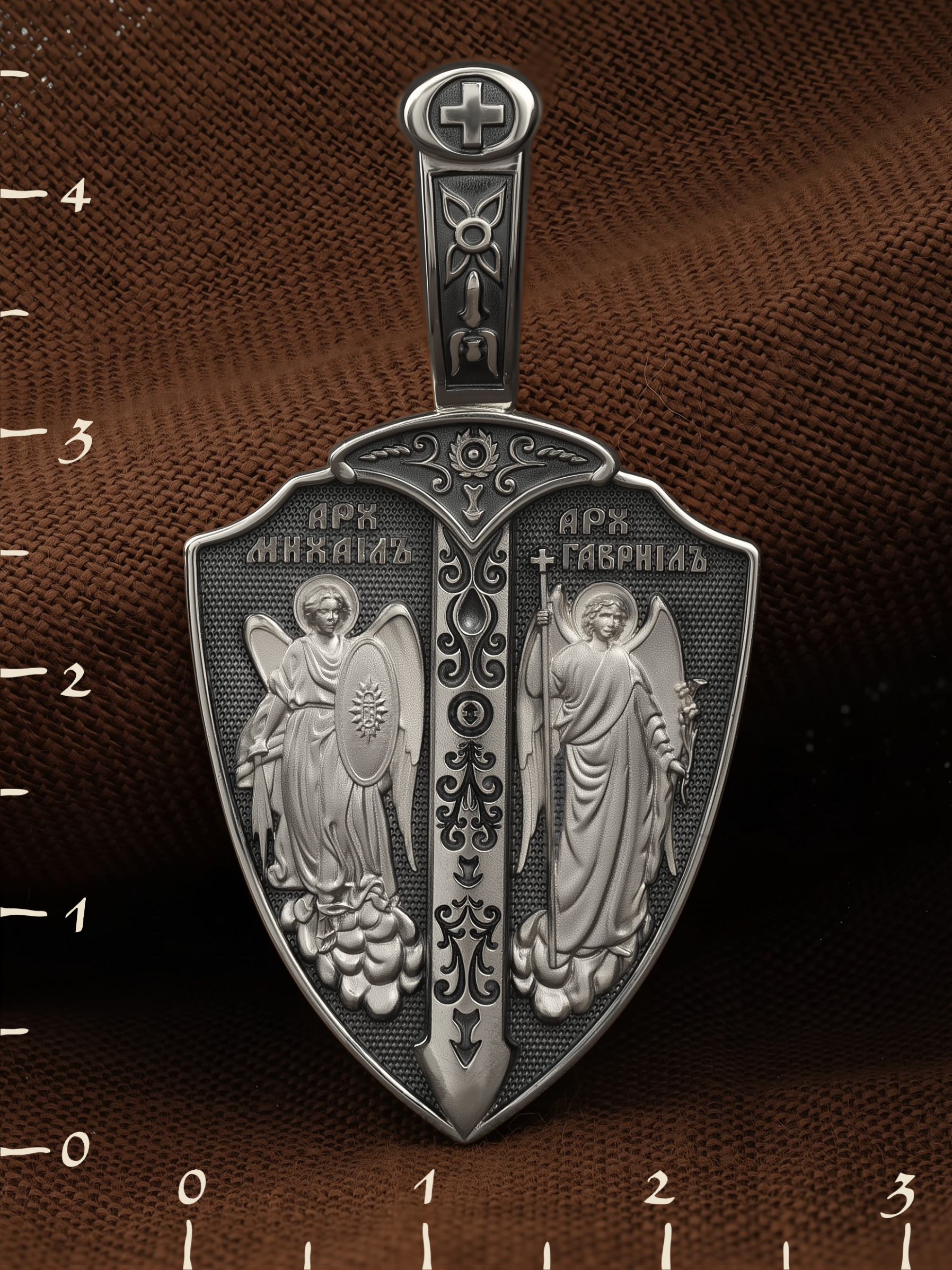 Образок выполнен в виде воинского щита и меча. На лицевой стороне образка изображены Архангел Михаил и Архангел Гавриил. Архангел Михаил изображен в воинственном виде с огненным мечом в правой руке и щитом в левой руке. Архангел Михаил — верный служитель Божий, который низринул с Неба возгордившегося денницу с другими павшими духами. В Православии его называют Архистратигом, что означает глава святого воинства Ангелов и Архангелов. Архангел почитается как покровитель воинов и всех верных Богу и ведущих борьбу против сил зла, борец против ересей, а также защитник душ умерших, страж райских врат. Архангел Гавриил изображен с крестом в правой руке и цветком лилии в левой руке. Он несколько раз упоминается в Писании, как Небесный вестник, которого Бог посылает, чтобы возвестить людям Свои планы о спасении рода человеческого. Так, Архангел Гавриил несколько раз являлся пророку Даниилу и раскрывал ему тайны пришествия Мессии, гонений антихриста и конца мира (Дан. 8, 16, 9−21). Перед пришествием Сына Божия в мир архангел Гавриил явился в храме старцу Захарии и сообщил ему о чудесном зачатии Предтечи. Через шесть месяцев он явился в Назарете Деве Марии с вестью об избрании Ее быть Матерью Христа Спасителя (Лк. 1). Когда Господь перед Своими страданиями молился в Гефсиманском саду до кровавого пота, на укрепление Его, по Церковному Преданию, был послан с Небес Архангел Гавриил. (Лк.22:43). Жены мироносицы услышали от Архистратига радостную весть о Воскресении Христовом.