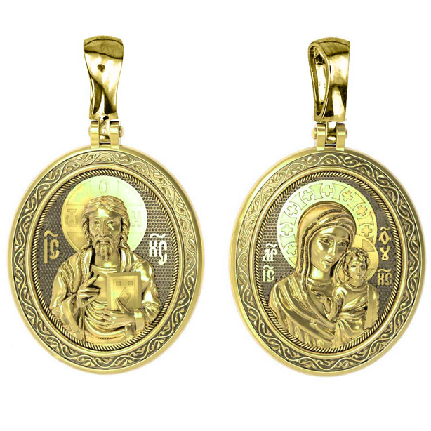 На обороте изображена Казанская икона Божией Матери — одна из самых почитаемых в России чудотворных икон Богородицы. Богословское значение Казанской иконы — указать верующим истинный Путь к спасению, который лежит через Христа. Только Божия Матерь имеет настолько сильное дерзновение к Спасителю, что может ходатайствовать перед Ним за всех верных. Именно этот образ дарится новой повенчанной паре, как хранитель очага и семейная реликвия. Молитва перед Казанской иконой Божьей Матери помогает во всех сложных случаях жизни, в болезнях, во всех печалях, невзгодах, скорбях. Уникальная история появления, чудеса, случившиеся по молитвам православных людей возле образа — все это делает Казанскую Богородицу особенной, среди тысяч других икон.