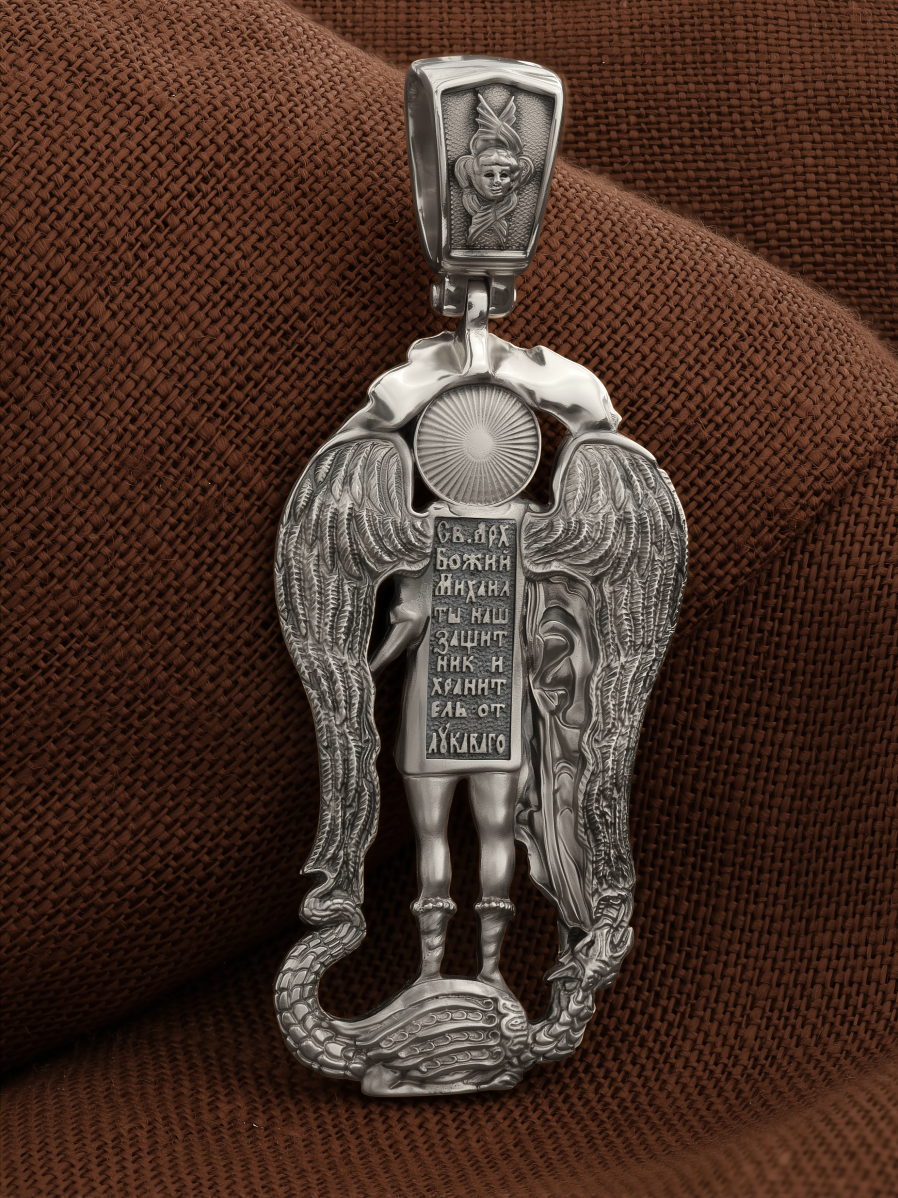 На обороте образка написана молитва Архангелу Михаилу: «Святой Архангел Божий Михаил! Ты наш защитник и хранитель от лукавого.»
