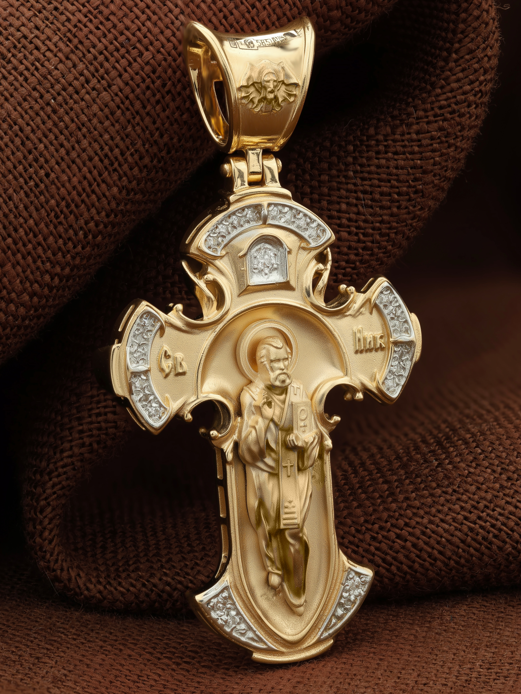 Оборотную сторону креста возглавляет икона святителя Николая Чудотворца. На кулонном кольце помещено изображение Спаса Нерукотворного — образ Спасителя, который Он запечатлел на плате и передал для исцеления больному проказой царю Эдессы. ему придается победное и защитное значение.